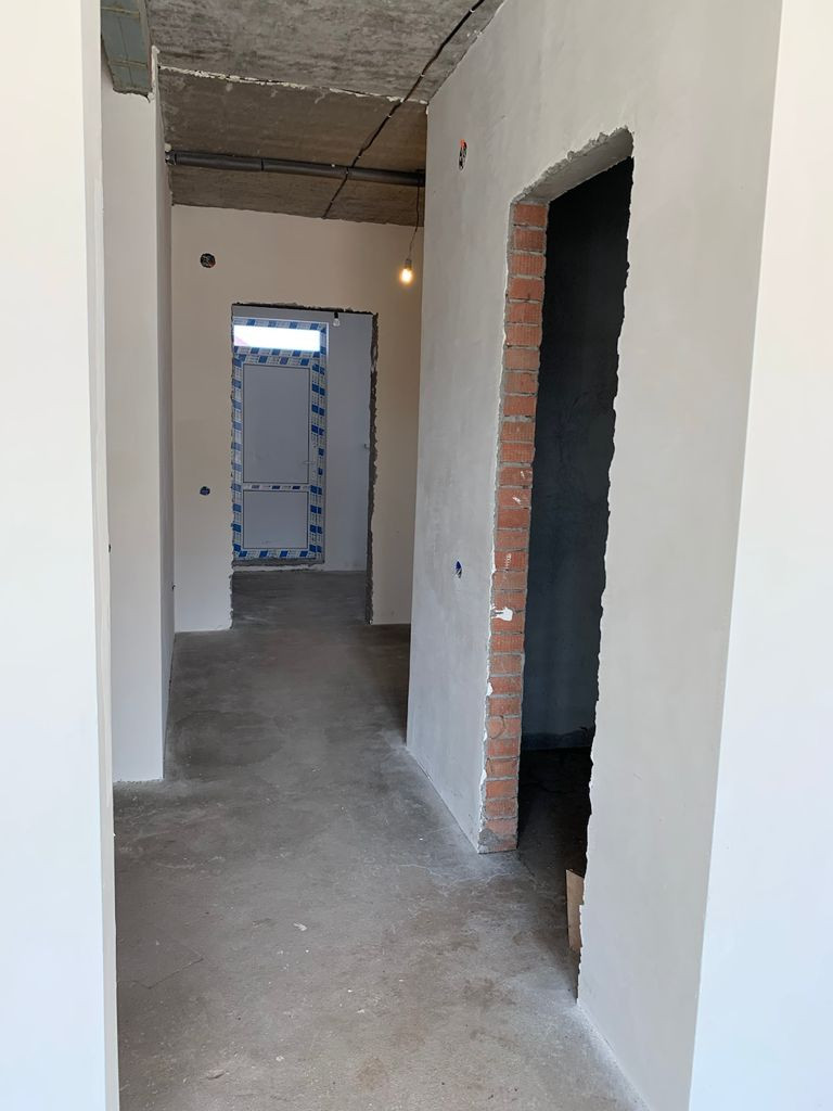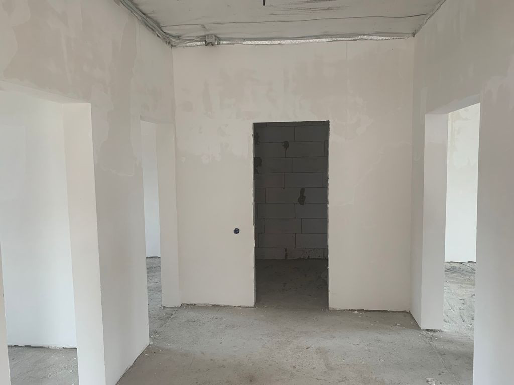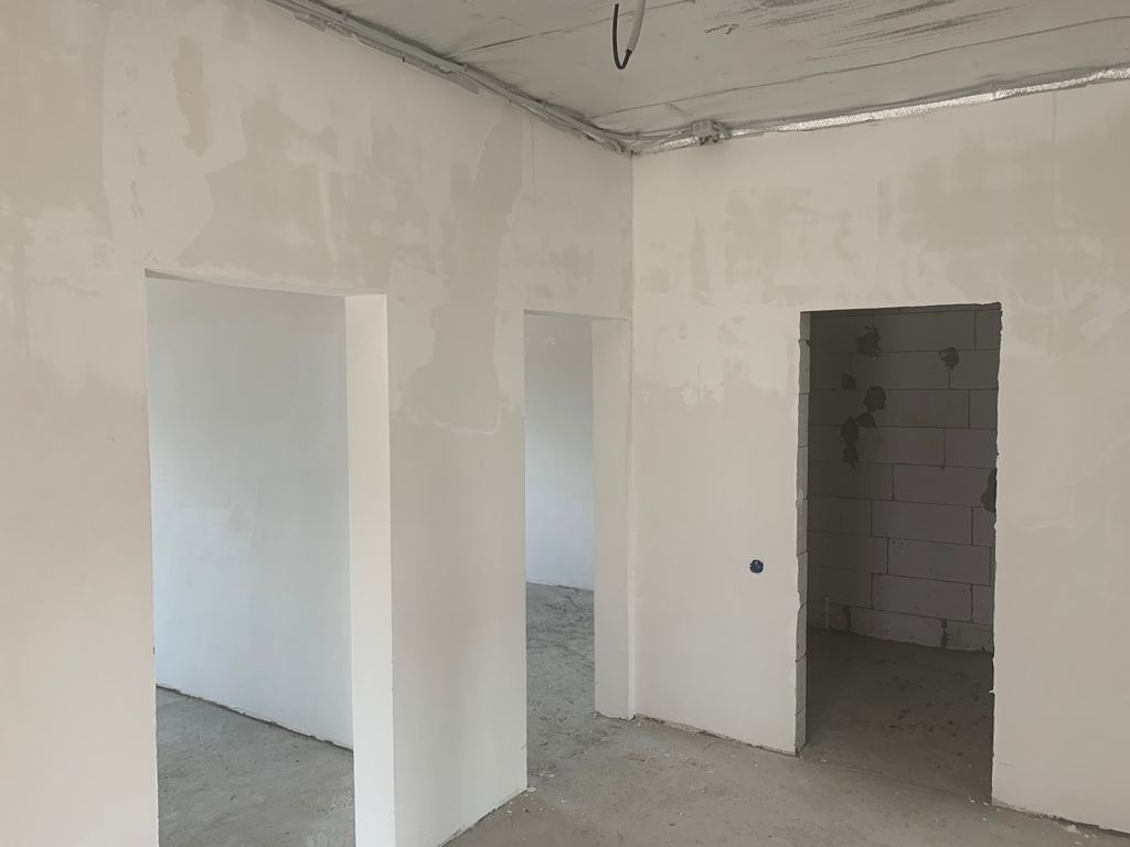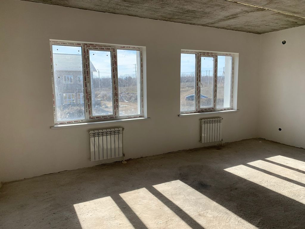 Отделка предчистовая (стены отштукатурены, откосы), установлены радиаторы отопления, газовый котел, теплый пол на первом этаже.