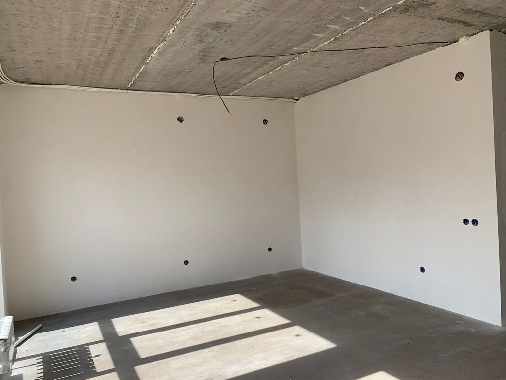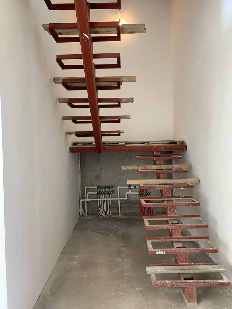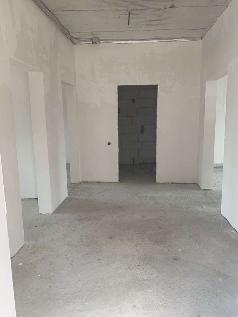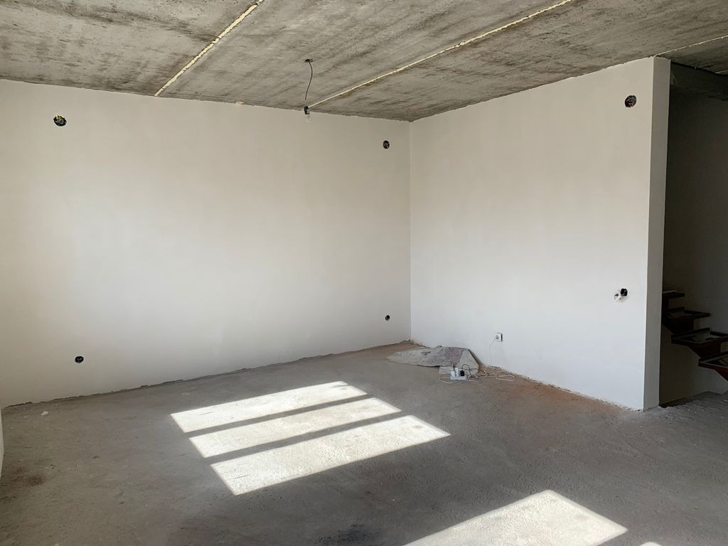 Отделка предчистовая (стены отштукатурены, откосы), установлены радиаторы отопления, газовый котел, теплый пол на первом этаже.