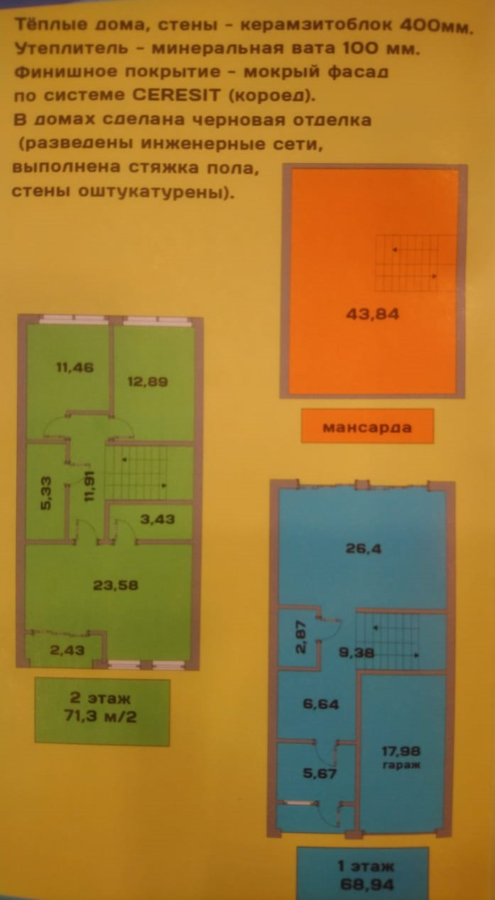 Таунхаусы сдаются с предчистовой отделкой, стяжка пола под покрытие, теплые полы на 1 этаже, выровненные стены под обои, электрическая и сантехническая разводка, газовое автономное отопление,  электро и водоснабжения подключены к централизованным сетям.Имеется мансарда, которую так же можно использовать как жилое помещение.