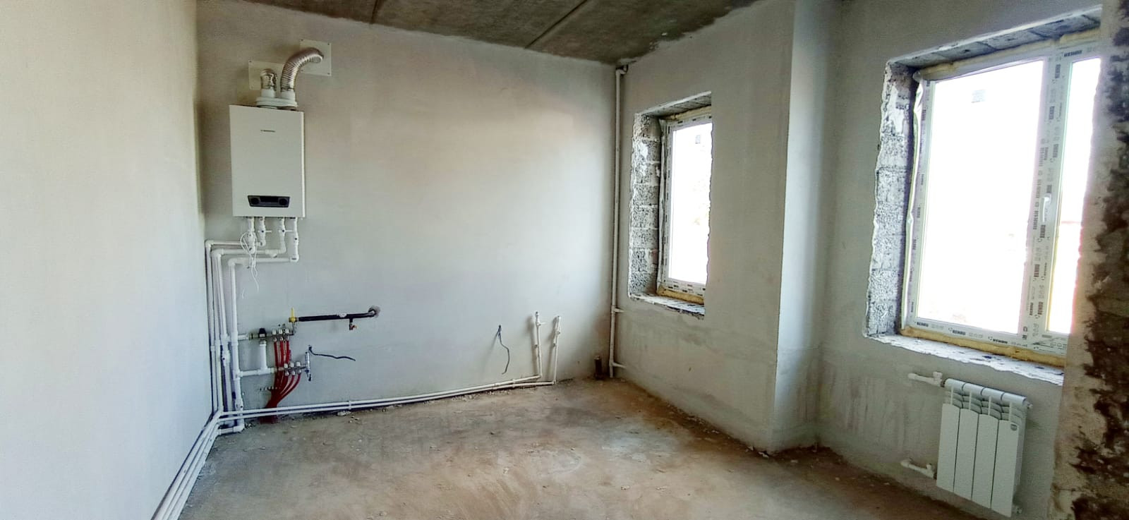 Машинная стяжка пола, теплые полы по всему периметру 1 этажа, выровненные стены под обои, электрическая и сантехническая разводка, газовое автономное отопление (установлен котел), системы газо-, электро- и водоснабжения подключены.