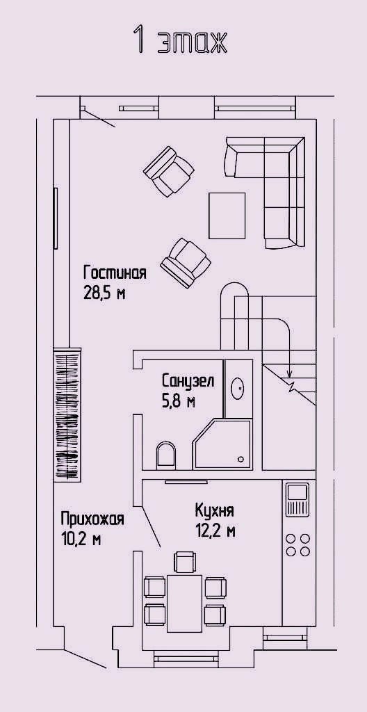 На первом этаже просторная прихожая 10,2 кв.м., кухня 12 кв м, гостевой санузел и просторная гостиная 29 кв м, с панорамным остеклением и выходом на Ваш участок.
