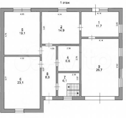 На первом этаже прихожая, погреб, кухня 14,9 кв.м., жилая комната 19 кв.м., жилая комната 23 кв.м., гараж 26 кв.м., сан. узел 6,6 кв.м, котельная-11,7 кв.м. с выходом на террасу.