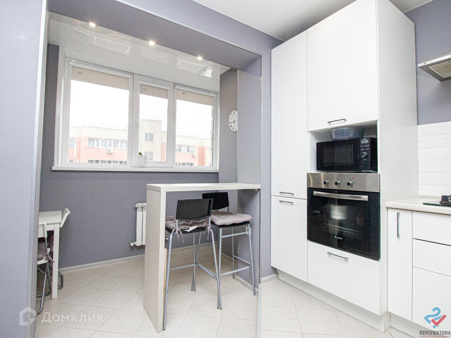 Кухня удобной прямоугольной формы. Балкон присоединен к кухне, что увеличивает полезную площадь. На кухне поставлена барная стойка, которая может быть использована как рабочее место, либо как дополнительная обеденная зона. Газовый котел надежно спрятан в красивый пенал. На кухне выложена плитка с подогревом.