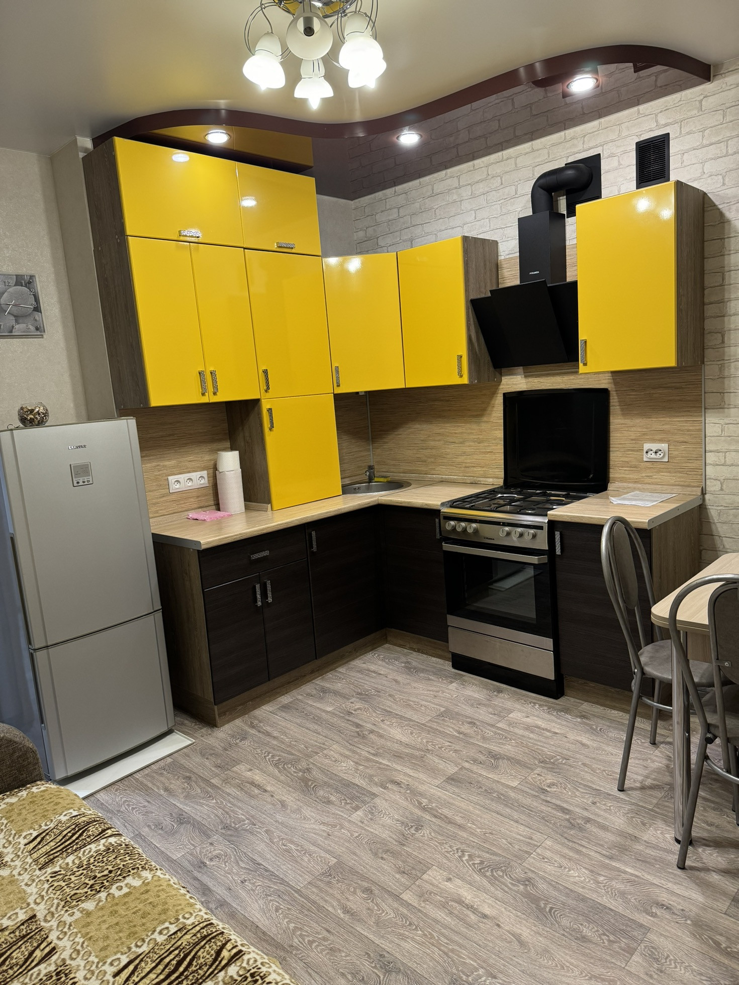-Кухонный гарнитур и встроенный шкаф большой, в кухне стол и стулья, диван.