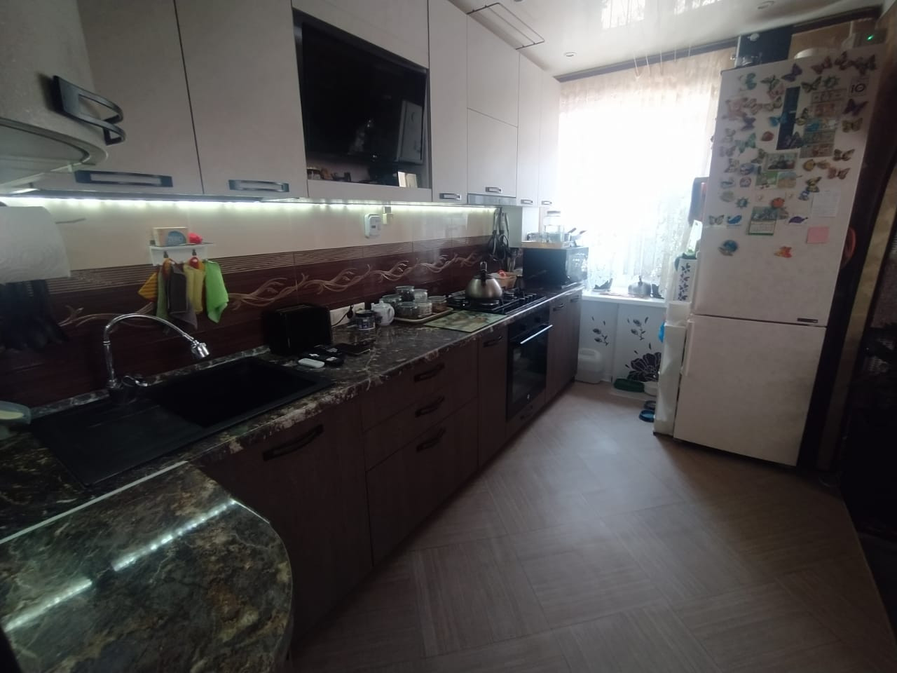 Общая площадь квартиры 80 кв.м.. Санузел раздельный. В квартире сделан хороший, качественный ремонт. Установлены пластиковые окна, натяжной потолок, паркет по всей квартире, на кухне плитка.