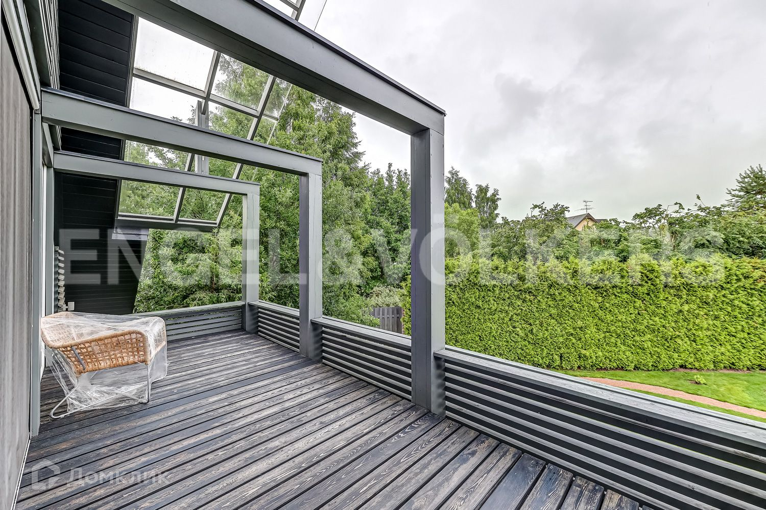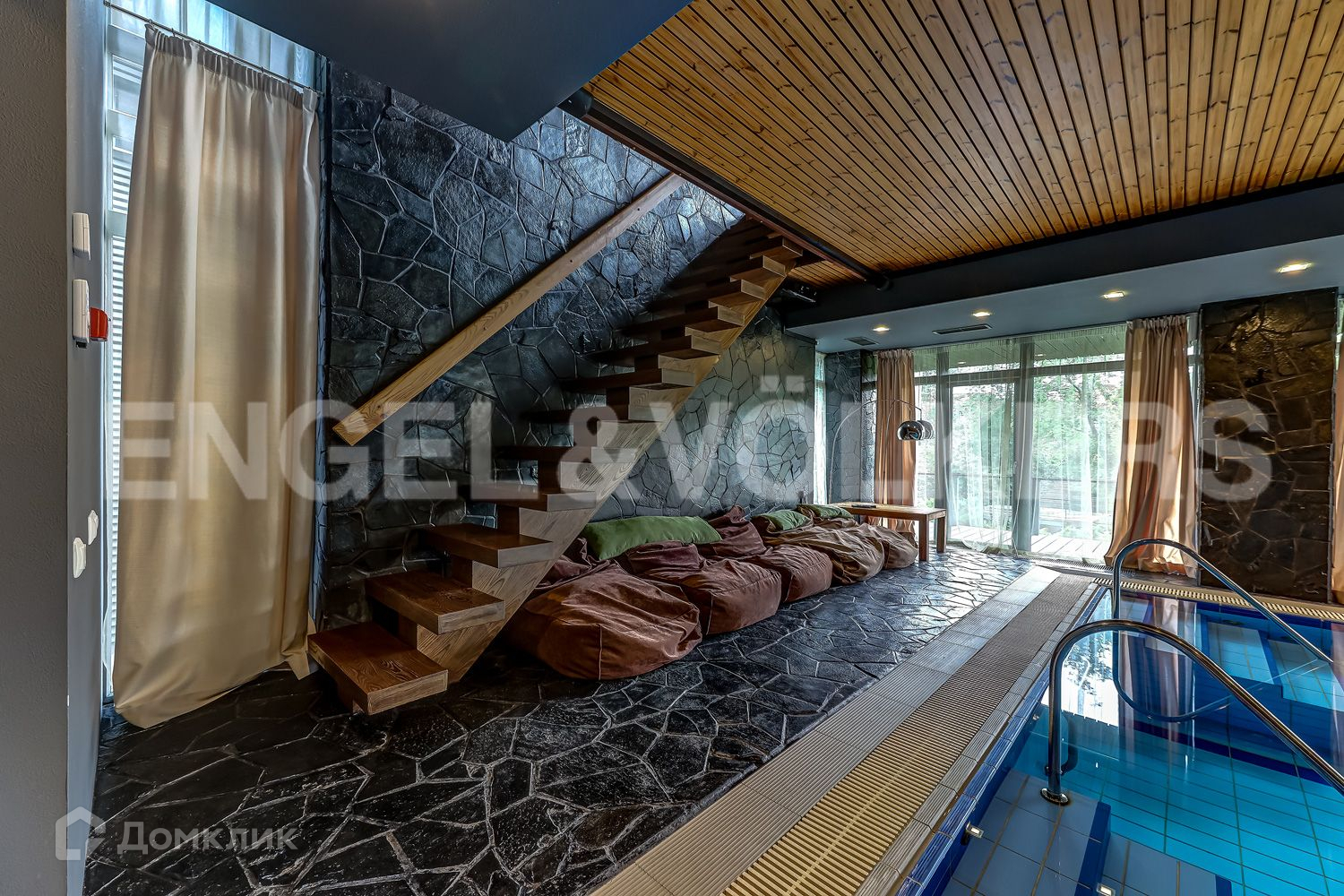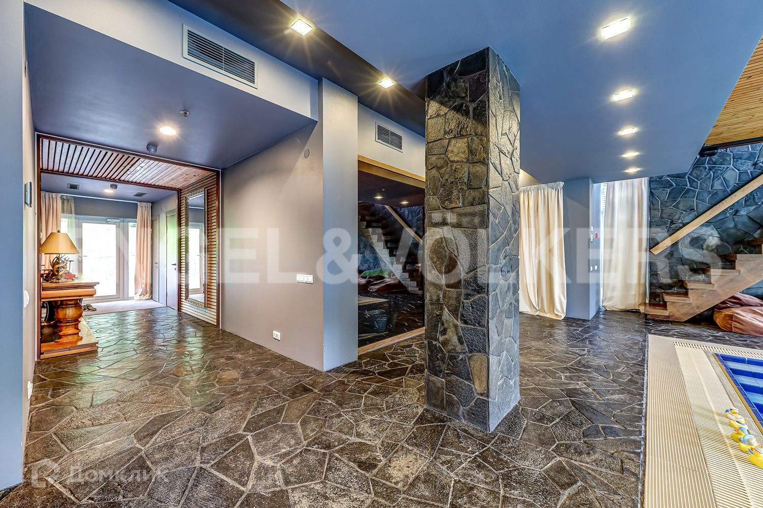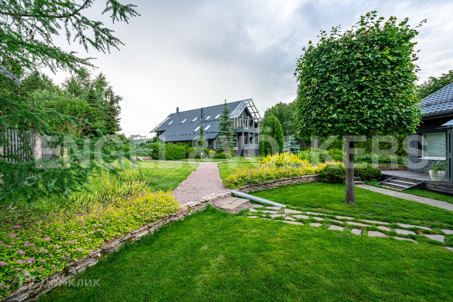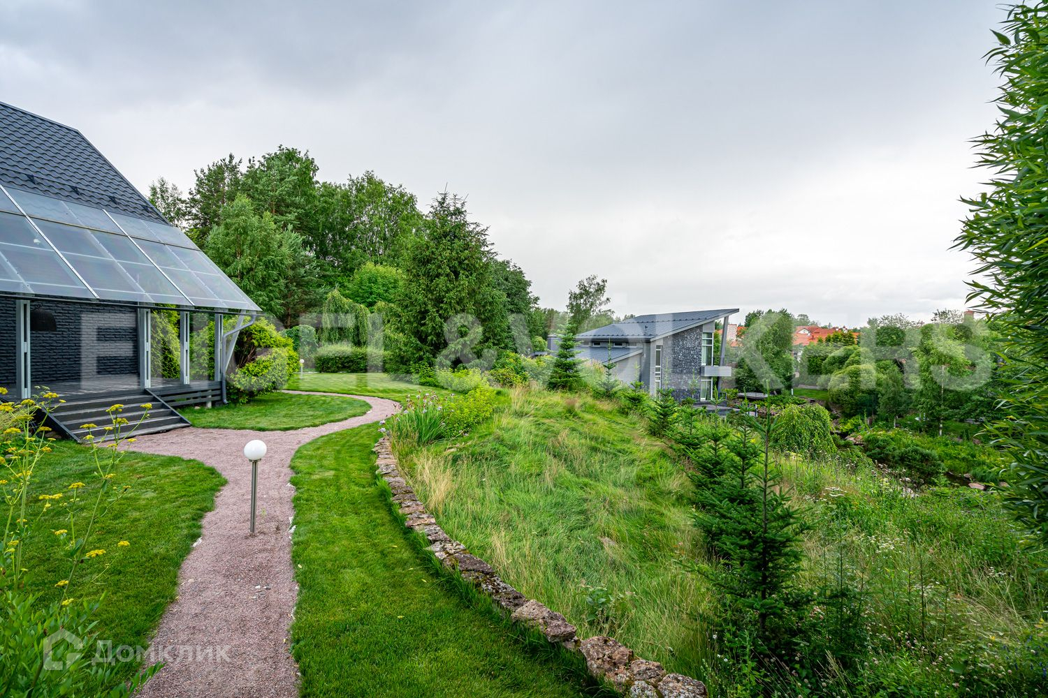 В глубине участка в приватной зоне расположены основной и гостевой дома. В основном доме закончен ремонт и частично завезена меблировка дома. Пространство грамотно продумано и зонировано. При входе расположена просторная гостиная с камином, вторым светом и панорамными окнами, зона столовой и кухни с выходом на террасу и переходом к патио, а также спальная комната с гардеробной зоной и кабинет. На втором этаже находится мастер спальня с гардеробной зоной, две детских спальни, две ванных комнаты и гардеробная.