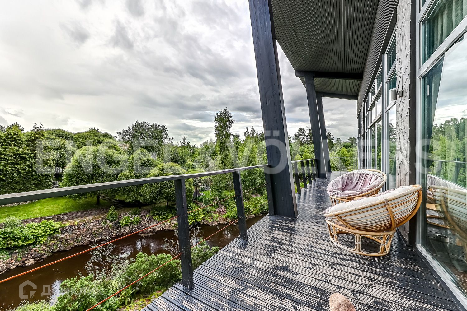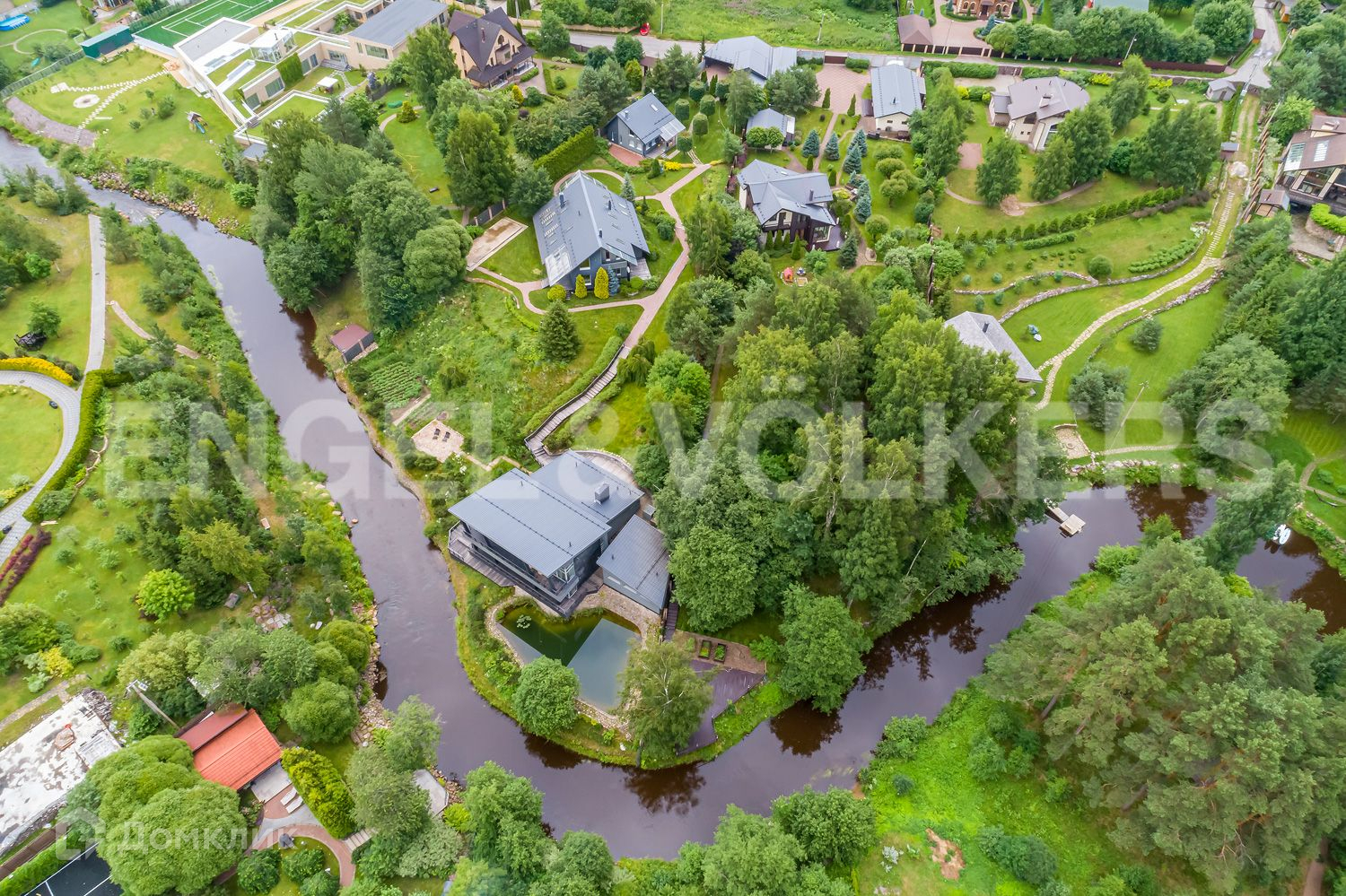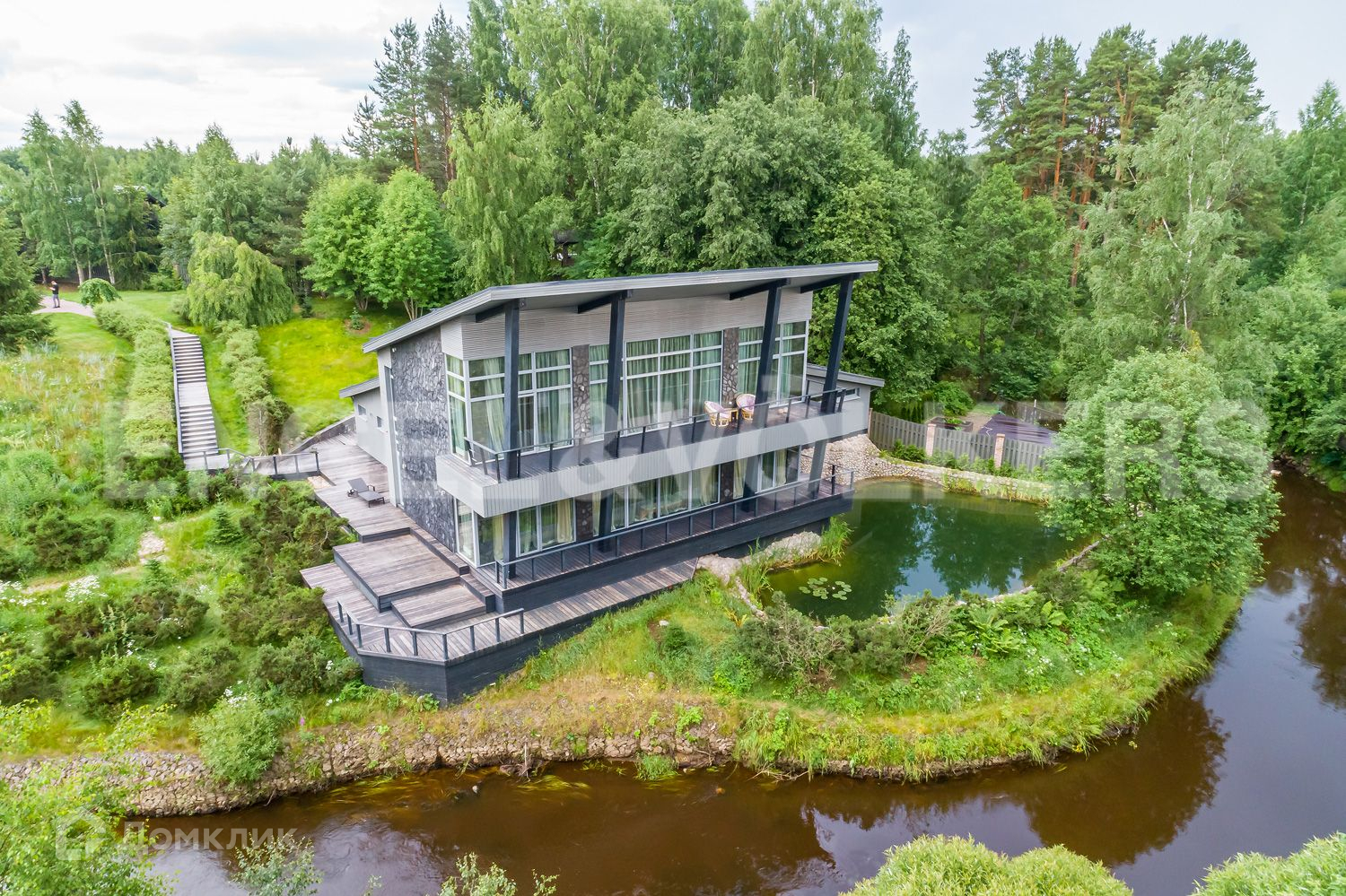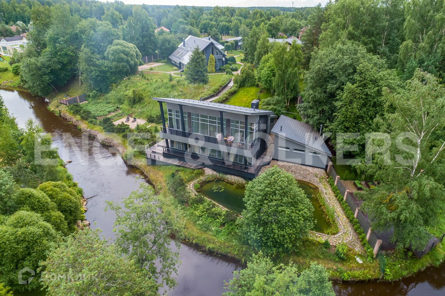 Усадьба расположена в закрытом и охраняемом поселке «Сестрорецкое». Благоустроенный участок с обилием хвойных растений сливается с р. Сестрой, проходящей прямо по границе территории, при этом берег реки укреплен и поднят достаточно для того, чтобы вода не заходила на участок в короткий период половодья.