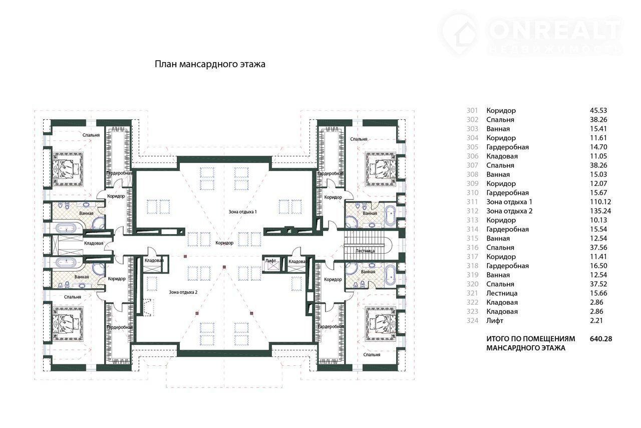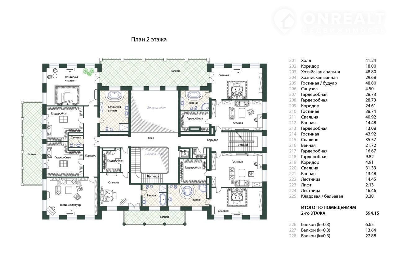 В жилой части дома по плану находятся гостиная, столовая, каминный зал, кухня, кабинет-библиотека, семь спален с ванными комнатами и гардеробными. Высота потолков в жилой части дома более 4-х метров.