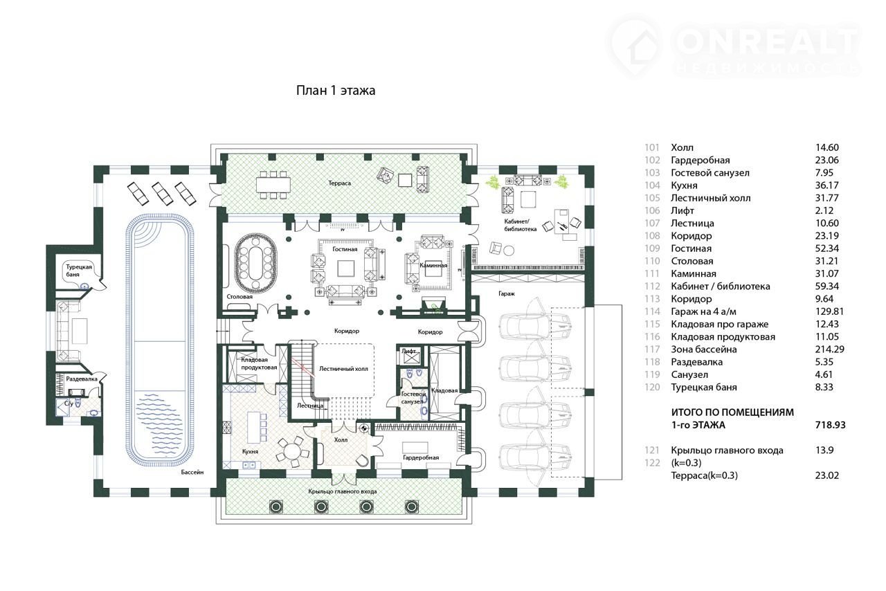 В соответствии с планом на первом этаже дома расположен  бассейн площадью 214 кв. метров с турецкой баней и теплый гараж на четыре автомобиля площадью 129 кв. метров. Земельный участок и дом в собственности более пяти лет. Покажем полную цену в Договоре. Возможна ипотека.