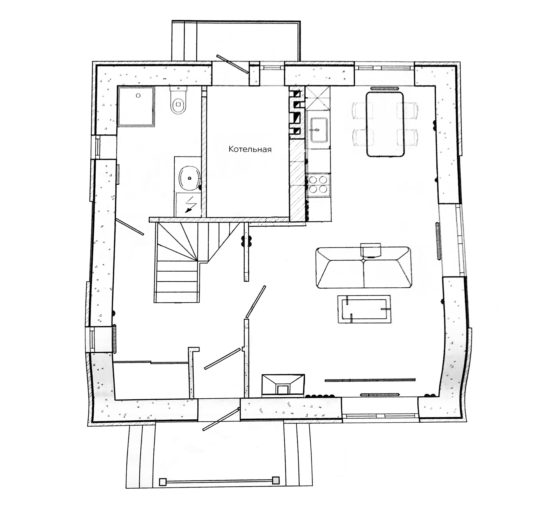 Фундамент — утеплённая плита. Стены — газобетон плюс кирпич. Котельная по всем правилам, с отдельным входом и усиленными стенами. Весь первый этаж — теплый пол. Высота потолков во всех комнатах — больше 3 метров.