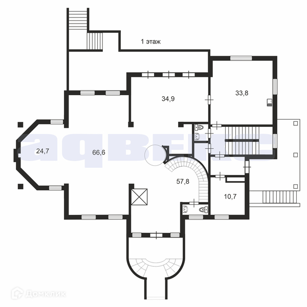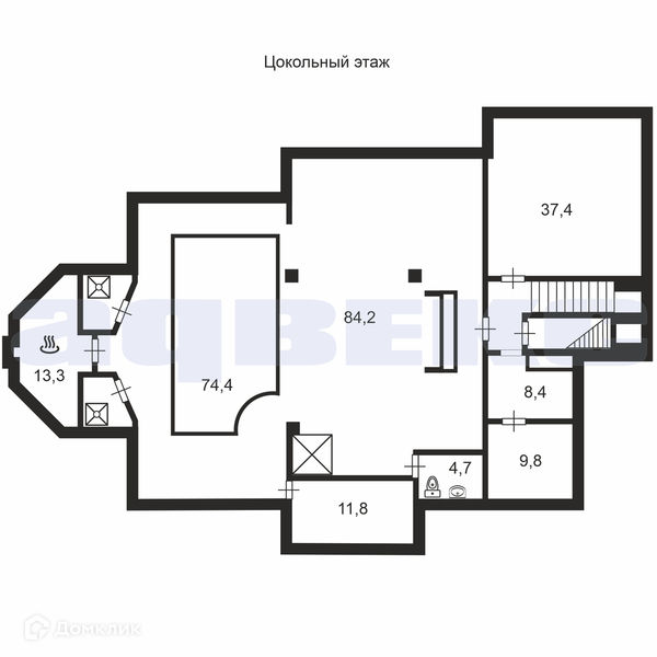 Цокольный этаж: сауна-парная, хамам, бассейн 27 м2, бильярдная, санитарно-техническое помещение для прачечной, кухня, санузел