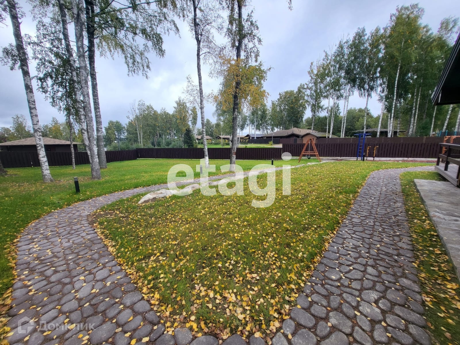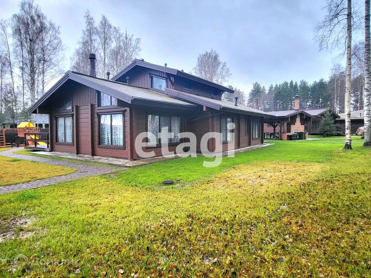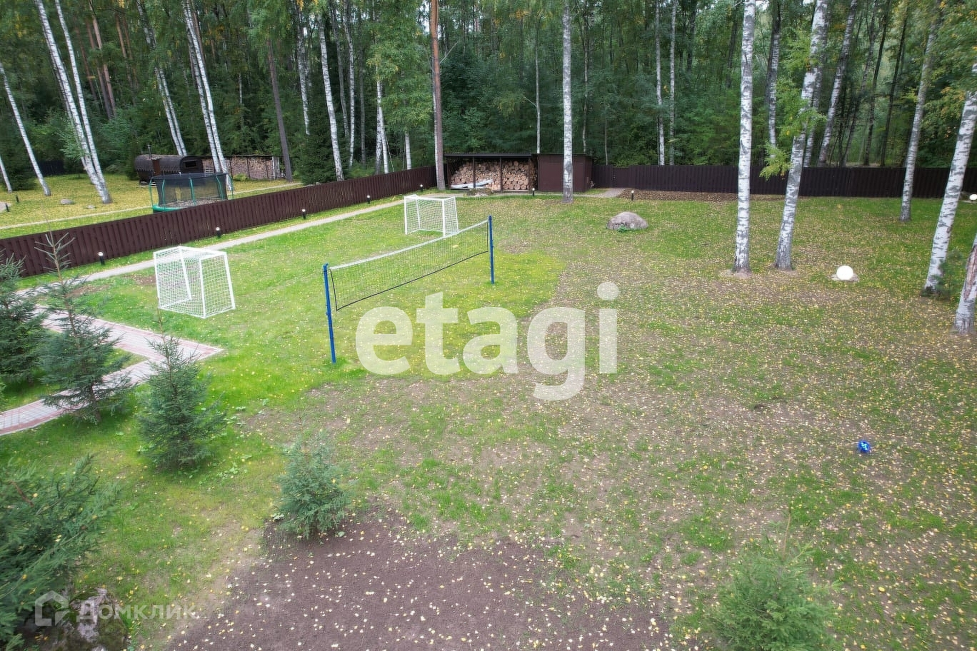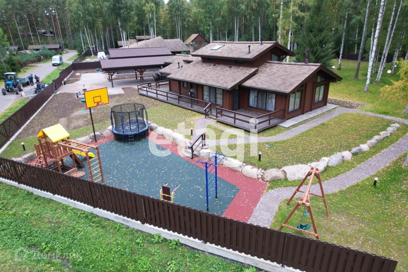 На ограждённой территории усадьбы организованы детская и спортивная площадки. Детская площадка покрыта безопасным резиновым покрытием. Спортивная площадка гармонично вливается в закрытую берёзовую рощу. Имеется хоз.блок и дровник.