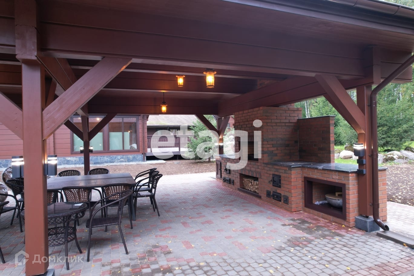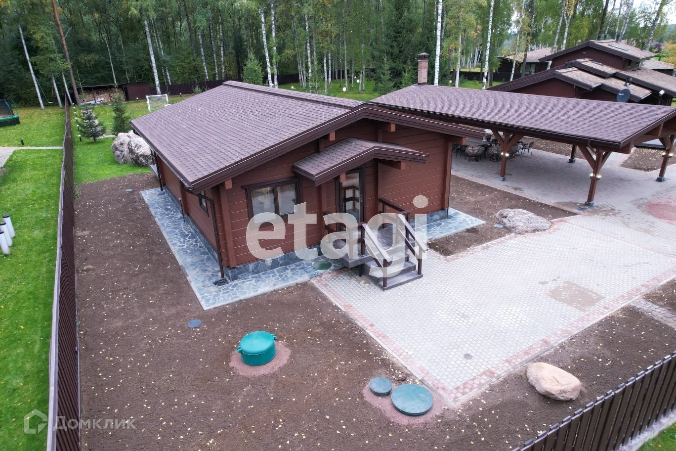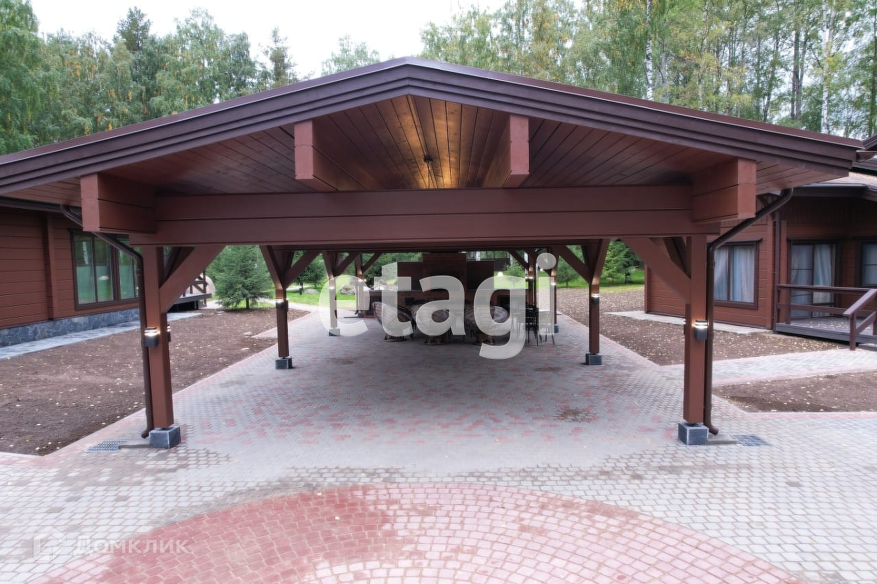 Между жилыми строениями расположена барбекю зона с каминным комплексом и парковочная площадка для авто, катера, квадроцикла или снегохода. Установлен навес общей площадью 132 кв. метра.