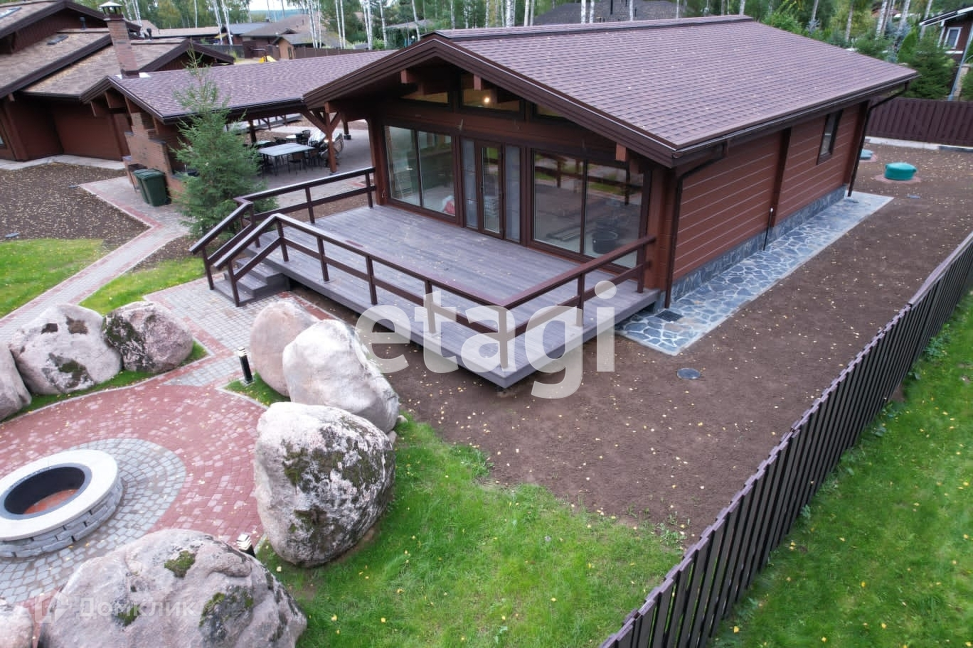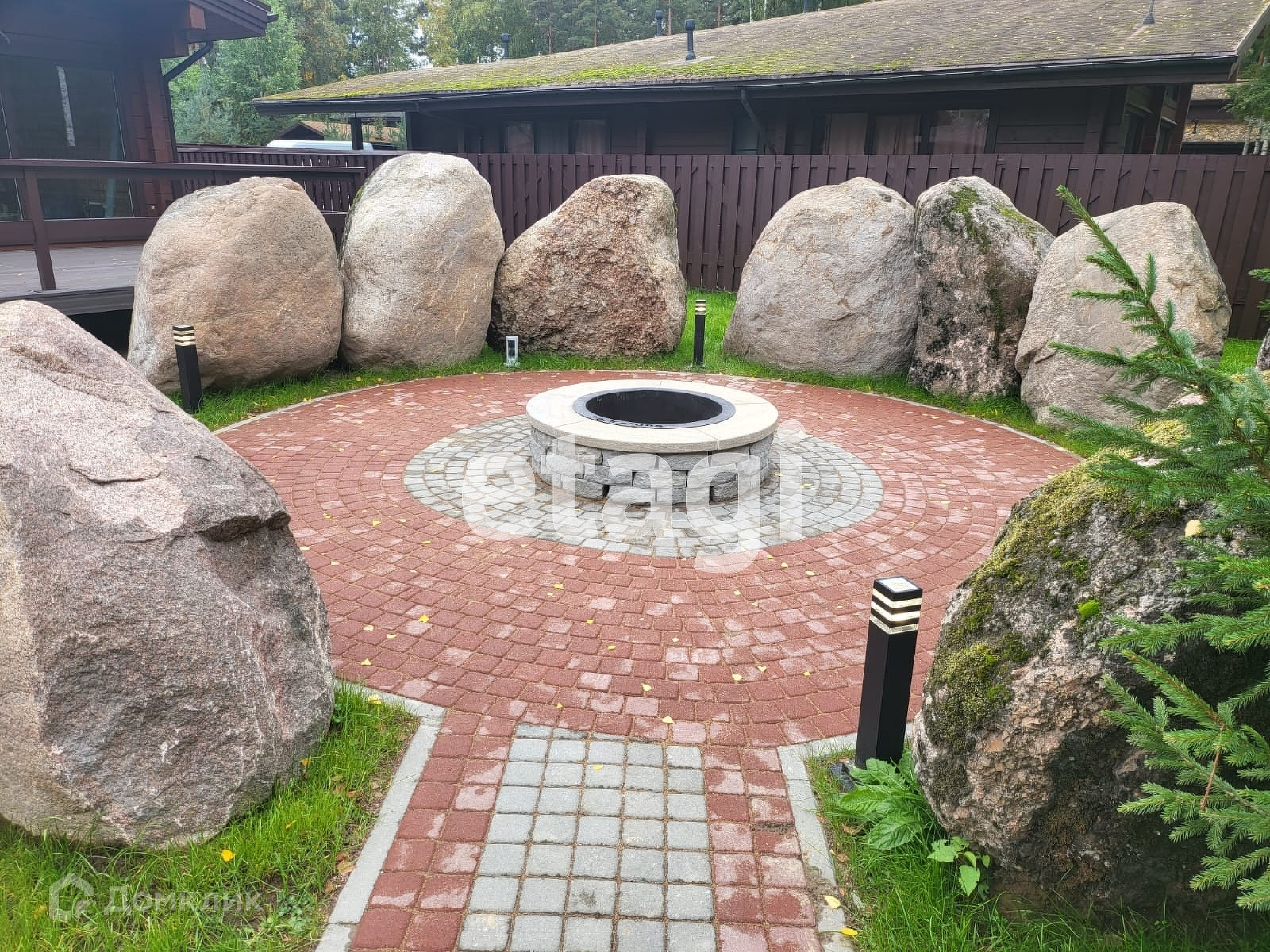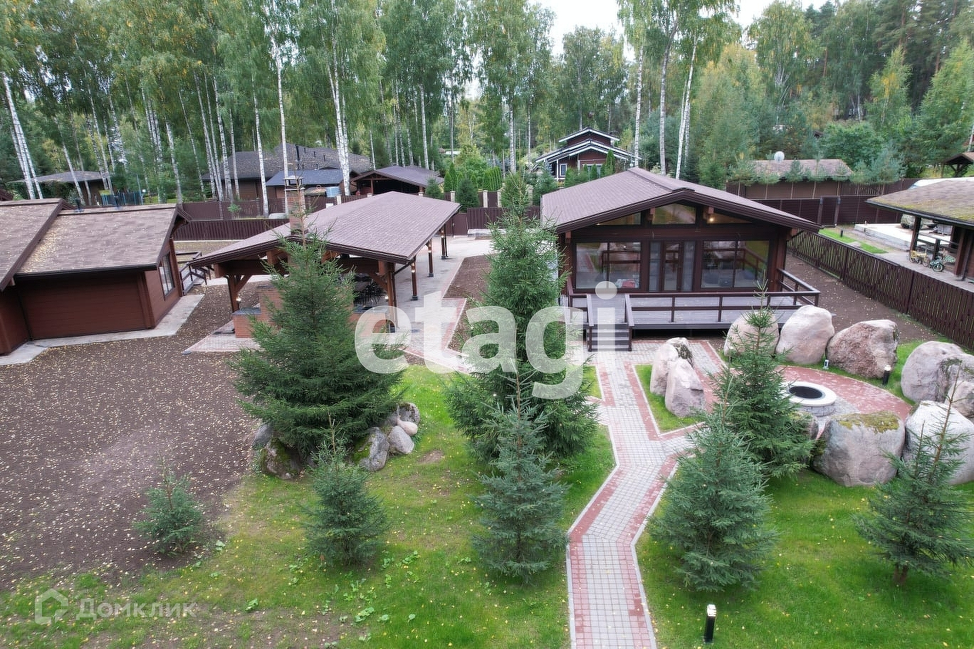 Между жилыми строениями расположена барбекю зона с каминным комплексом и парковочная площадка для авто, катера, квадроцикла или снегохода. Установлен навес общей площадью 132 кв. метра.