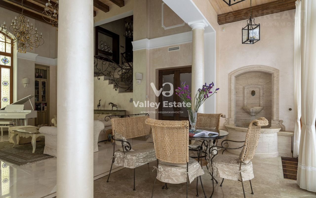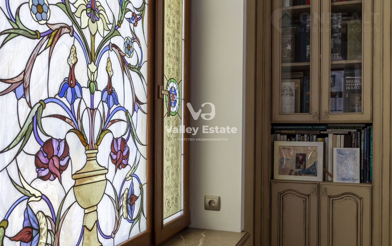 — просторная гостиная с витражами мастерской Сергея Подпружникова, созданными на основе орнамента индийского шелкового ковра ручной работы (на полу гостиной). Акцентами гостиной со вторым светом являются белый электронный рояль итальянской фирмы Галилео, камин (портал из травертина) и фонтан для золотых рыбок (также отделан травертином);