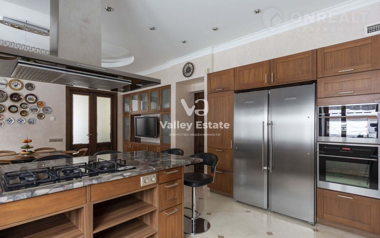 — кухня-столовая разделена на рабочую зону и обеденную с большим столом. Мраморный остров станет любимым местом как для тихого уединенного утра с первой чашкой кофе, так и для сбора шумных гостей пока хозяйка готовит ужин. Раздвижной обеденный стол ОDYSSЕY (дизайнер: Саlligаris Studiо) со столешницей в форме эллипса выполнен из закалённого черного стекла. Столешницы в кухне – бразильский гранит с выразительными цветовыми акцентами. Фасады производства немецкой фирмы Наiеr Кitсhеn выполнены орехом.