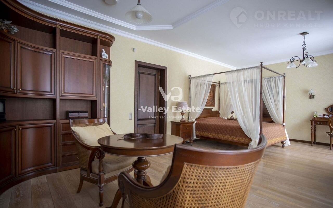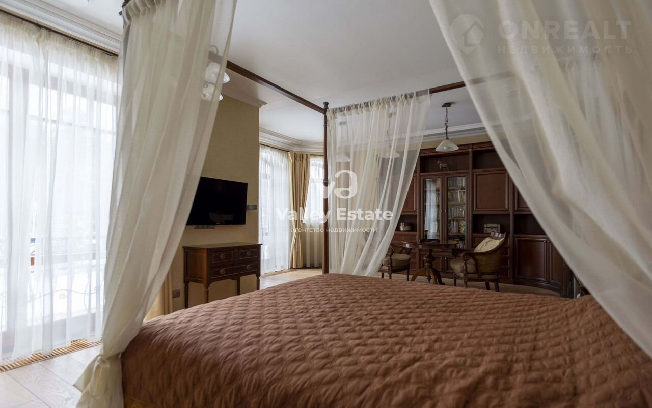 — мастер-спальня с гардеробной и санузлом. Мебель Гранж в колониальном стиле: кровать с пологом, туалетный столик, небольшая угловая библиотека, два французских балкона с роскошным видом на свой собственный лес;