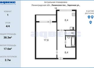 Однокомнатная квартира на продажу, 38.3 м2, Заречная улица, 13