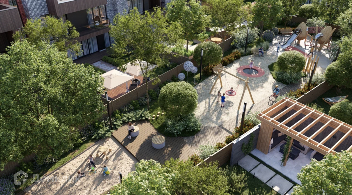 Насыщенное зонирование с арт-объектами, интерактивными игровыми площадками. Эмпирическая зона с тактильной тропой, ароматическими травами, злаковыми и хвойными растениями, кинетическими скульптурами, местами отдыха для взрослых (гамаки, навесы с качелями, пуфы) и развлечений для детей. Многообразие возможностей для созерцания и коллекционирования ощущений, всесезонные беседки, настилы, лавочки, площадки для прогулки и дрессировки собак. Частный детский сад на 120 мест и развивающаяся инфраструктура, видовой ресторан на территории, СПА и банный комплекс.
