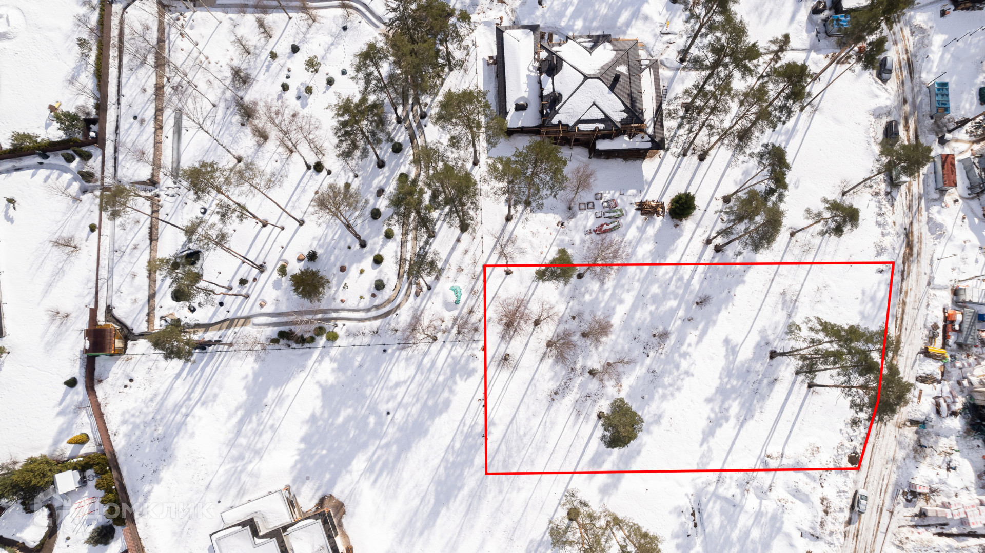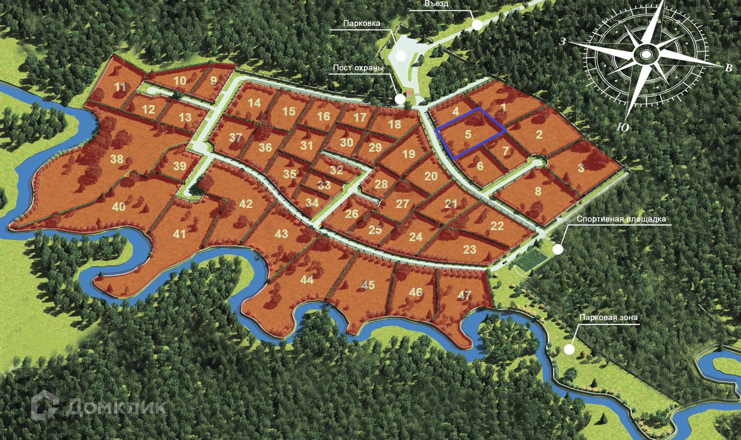 Участок правильной прямоугольной формы, высокий, сухая песчаная почва. В поселке чуть больше 40 домовладений (все участки проданы), идет активная застройка.