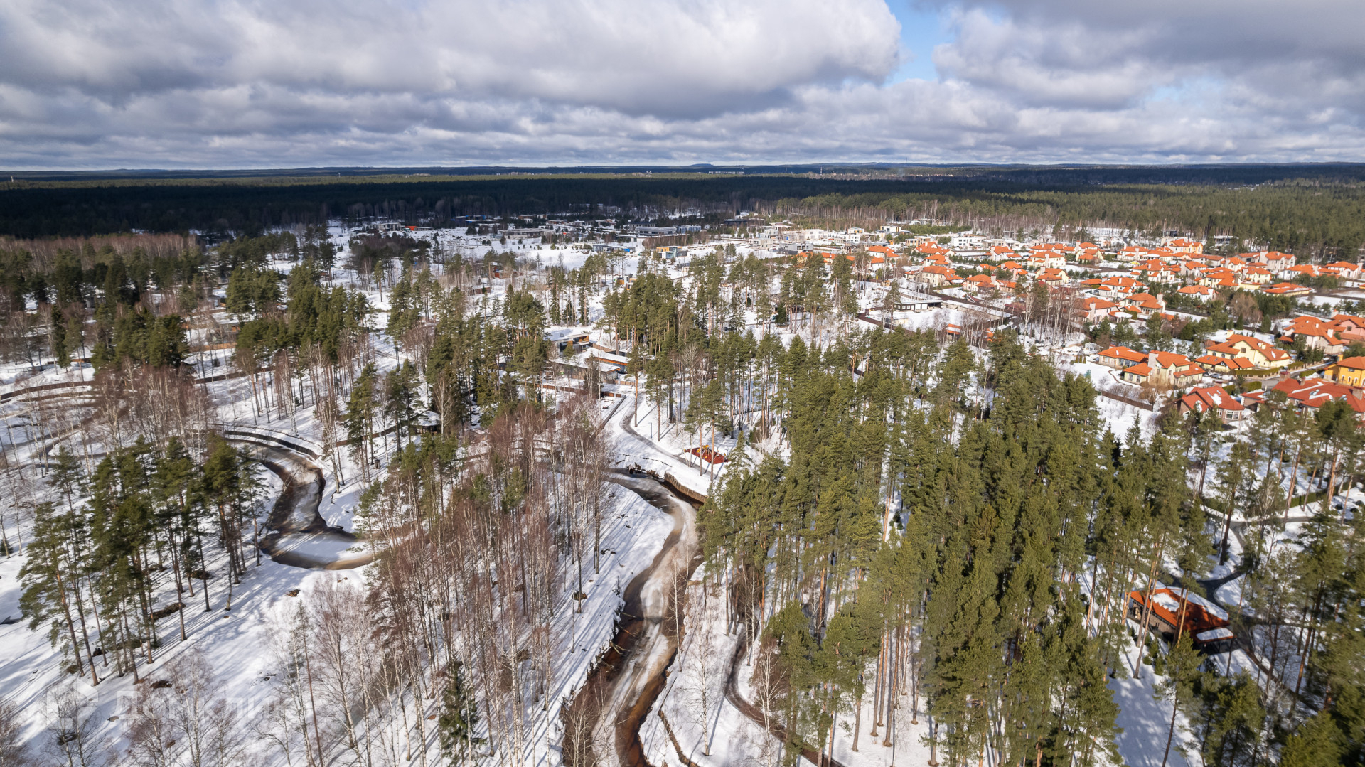 Поселок расположен вдоль реки Сестры в близи курортной зоны Санкт-Петербурга. Закрытый охраняемый периметр с пунктом охраны и шлагбаумом.
