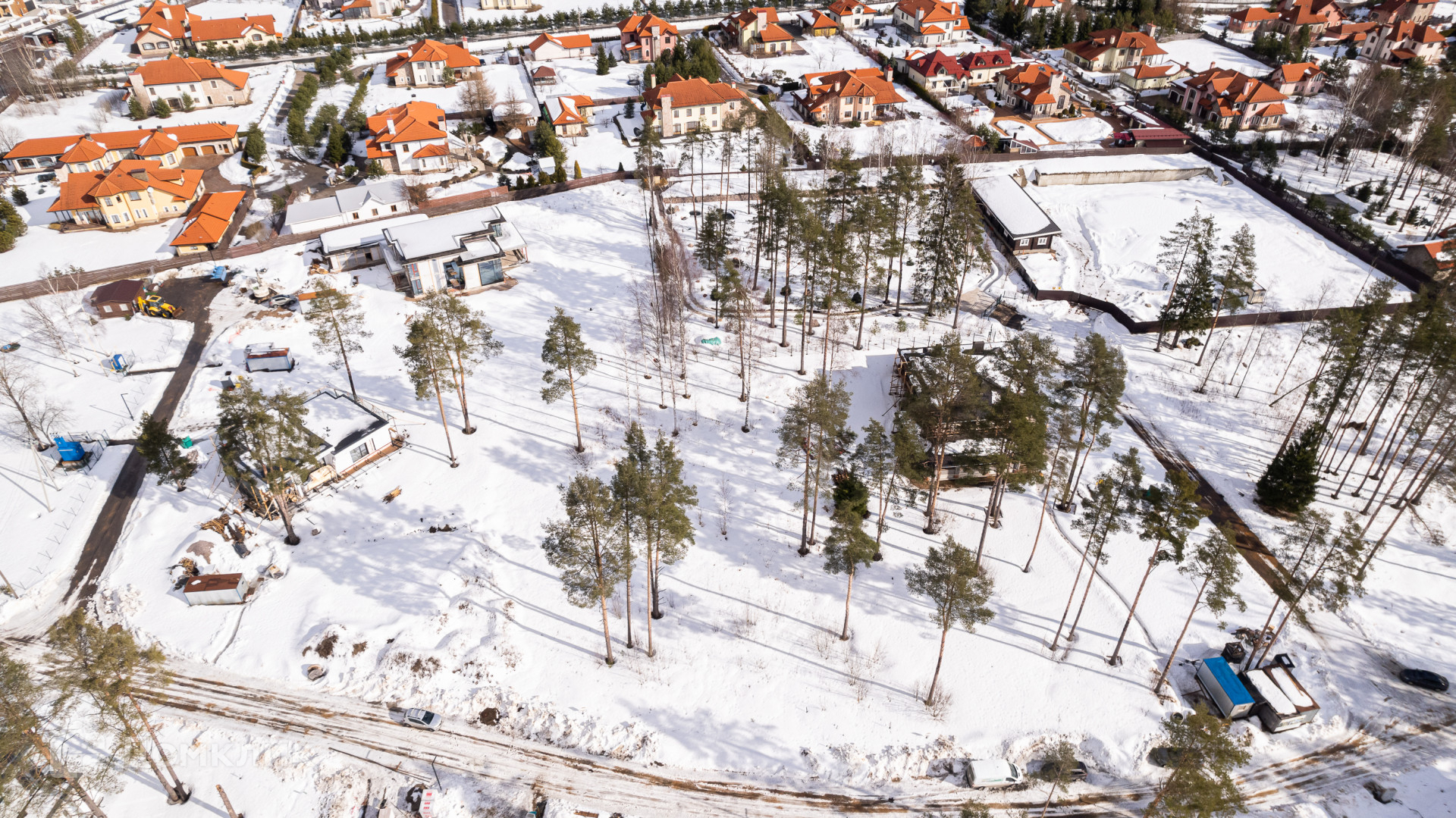 На участке вековые сосны и ели. Удобное расположение по ген плану – в начале поселка. Единое фасадное ограждение участков и строгая концепция архитектурного стиля дома с плоскими кровлями и большой площадью остекления.