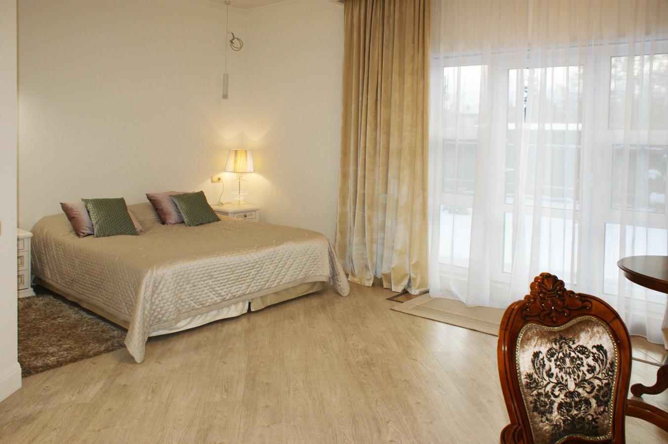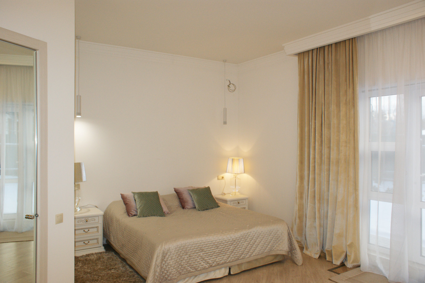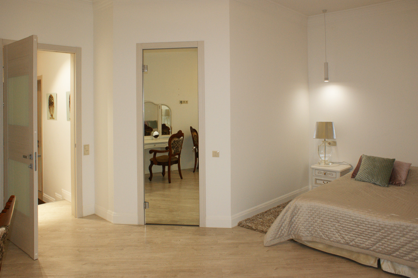 4 изолированные комнаты: большая спальня(25 кв.м.) со своей гардеробной комнатой, которую можно переделать в спальню для ребёнка и санузлом (с ванной), с выходом на террасу, две спальни - одна с собственным санузлом, рядом с которыми общая гардеробная комната, кабинет (свободная комната, можно использовать как спальню)