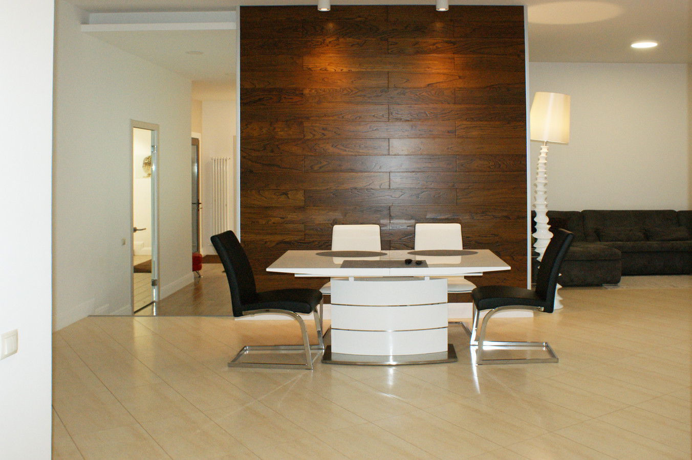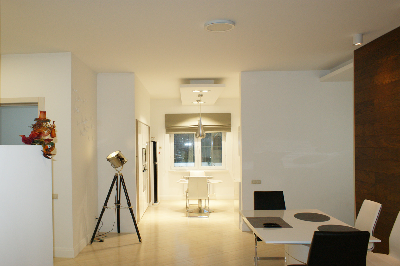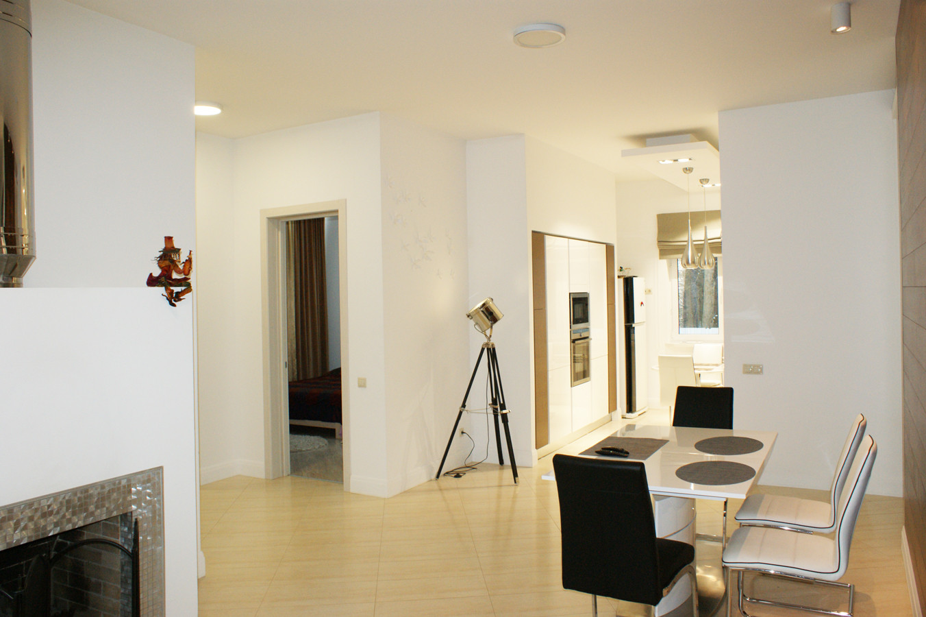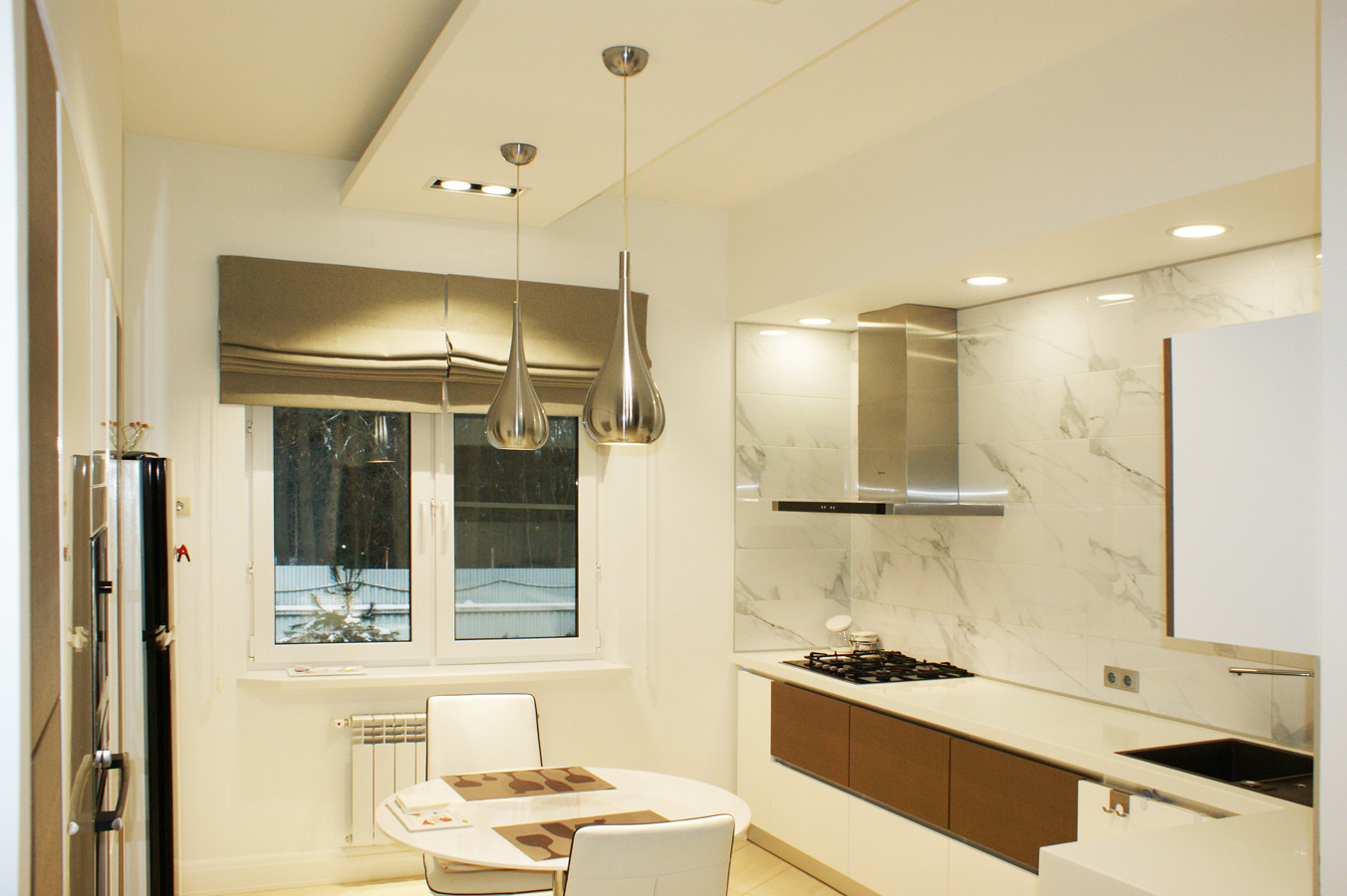 Кухня соседствует с столовой и зоной отдыха. Точечное , многоуровневое освещение удобно выделяет зоны отдыха. Высокие потолки и мягкий интерьер подчеркивают состояние комфорта и уюта.