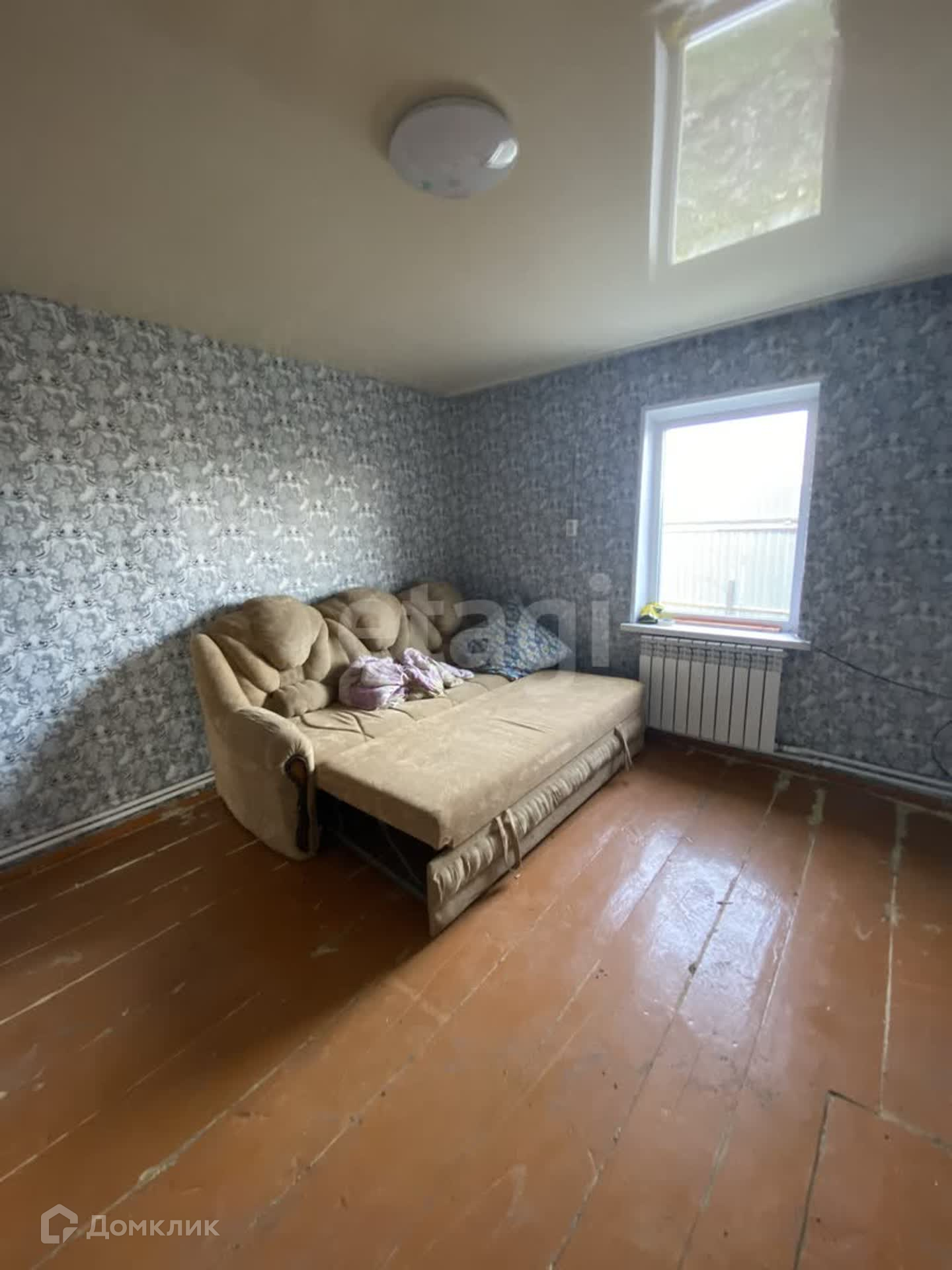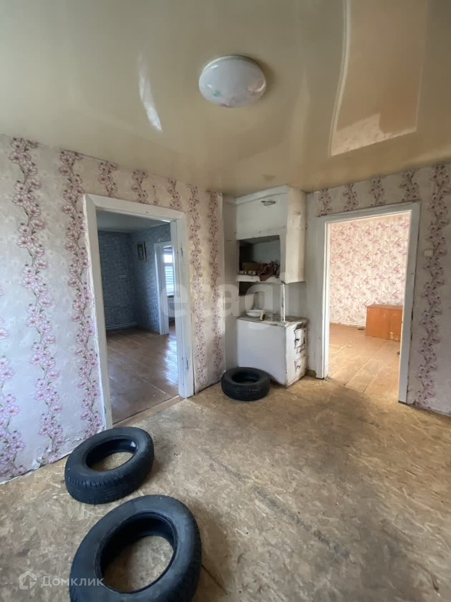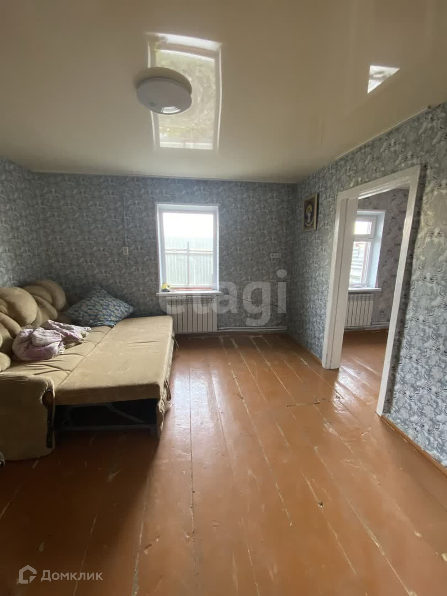 В доме три комнаты, установлено газовое отопление, новый газовый котел, натяжные потолки, наклеены свежие обои. Крыша дома из шифера.