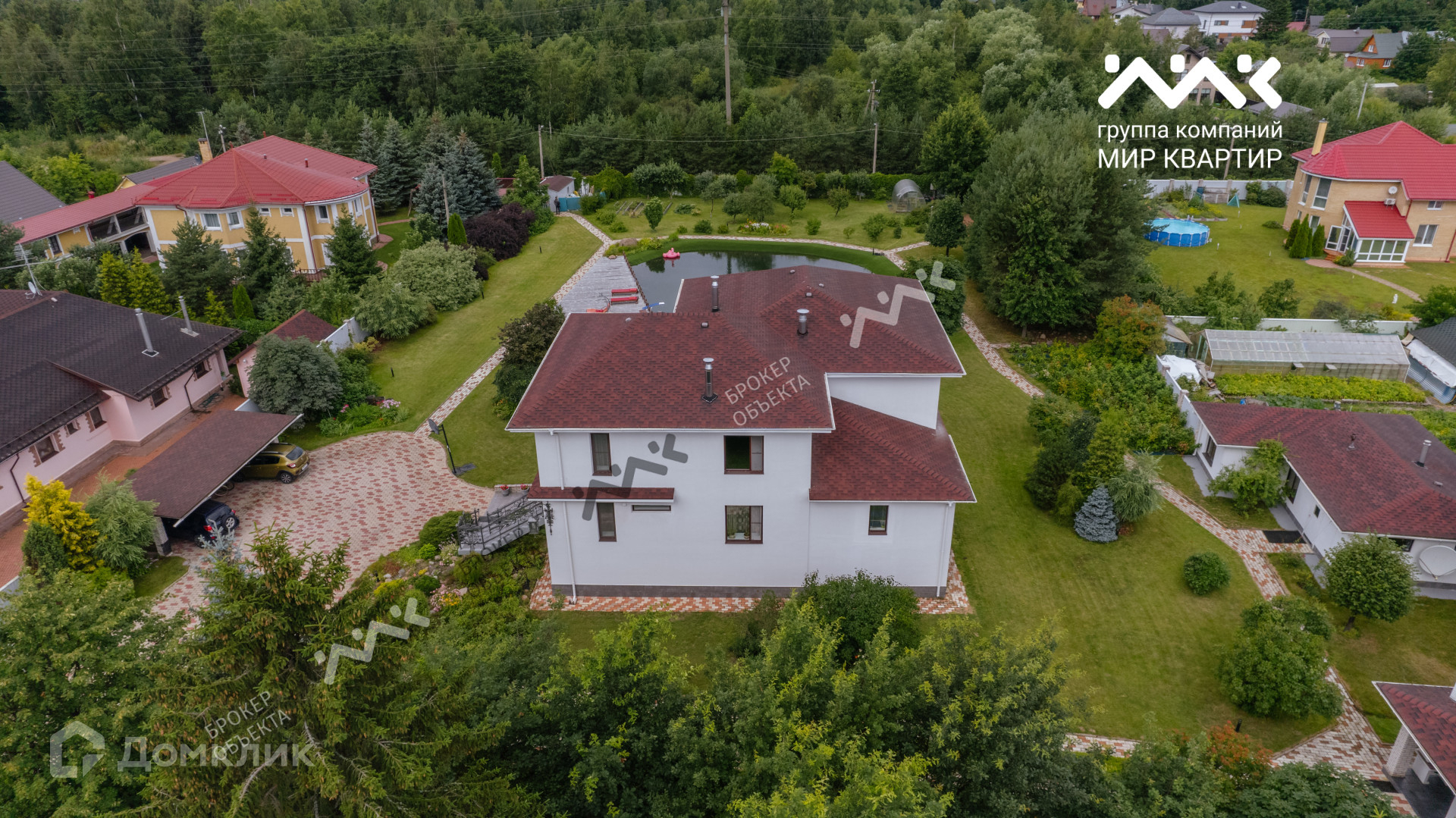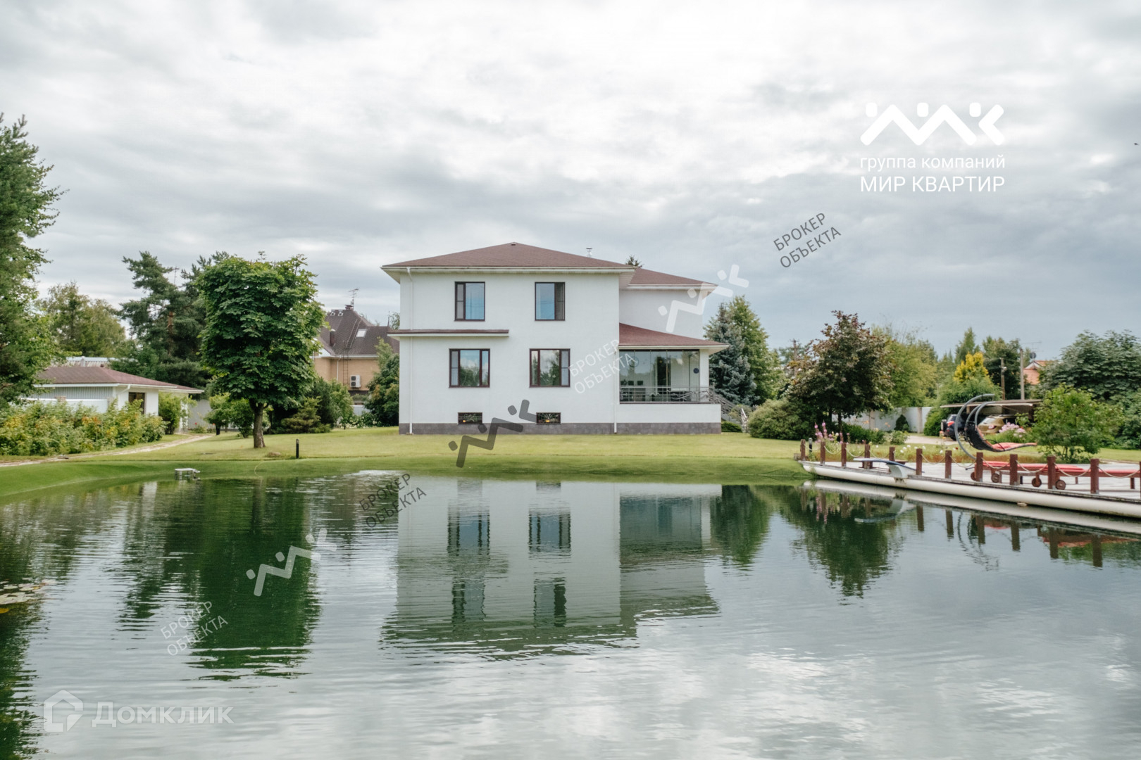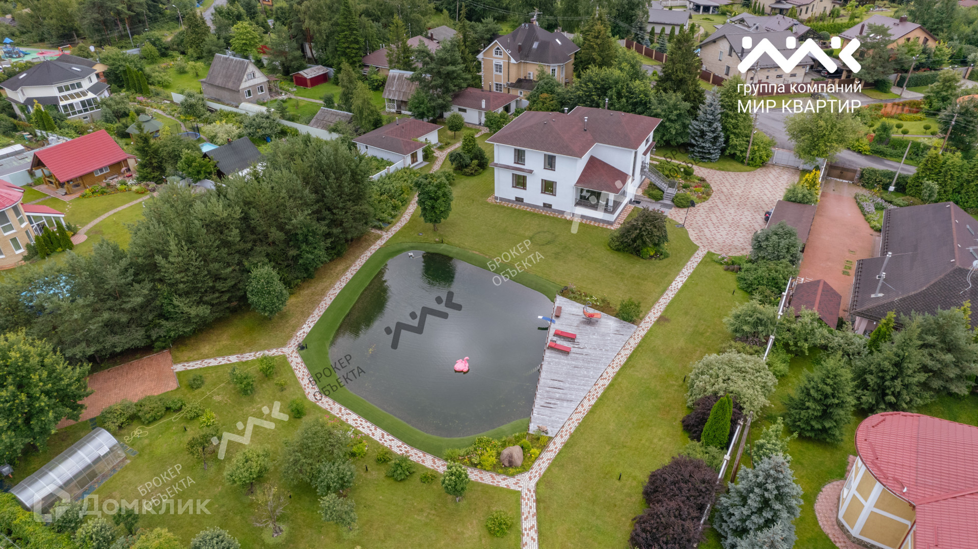 На участке живописный водоем, который по праву  может называться  маленьким озером с системой фильтрации, сохранены сосны, плодовые деревья и кустарники.
