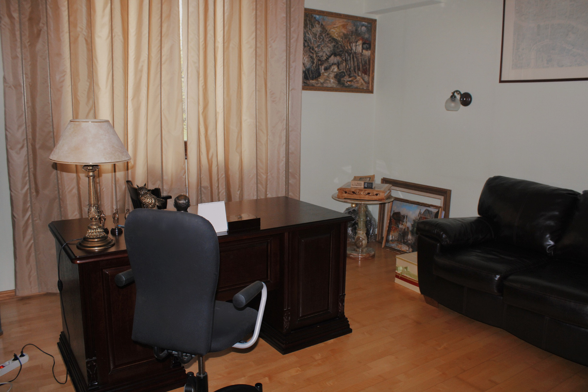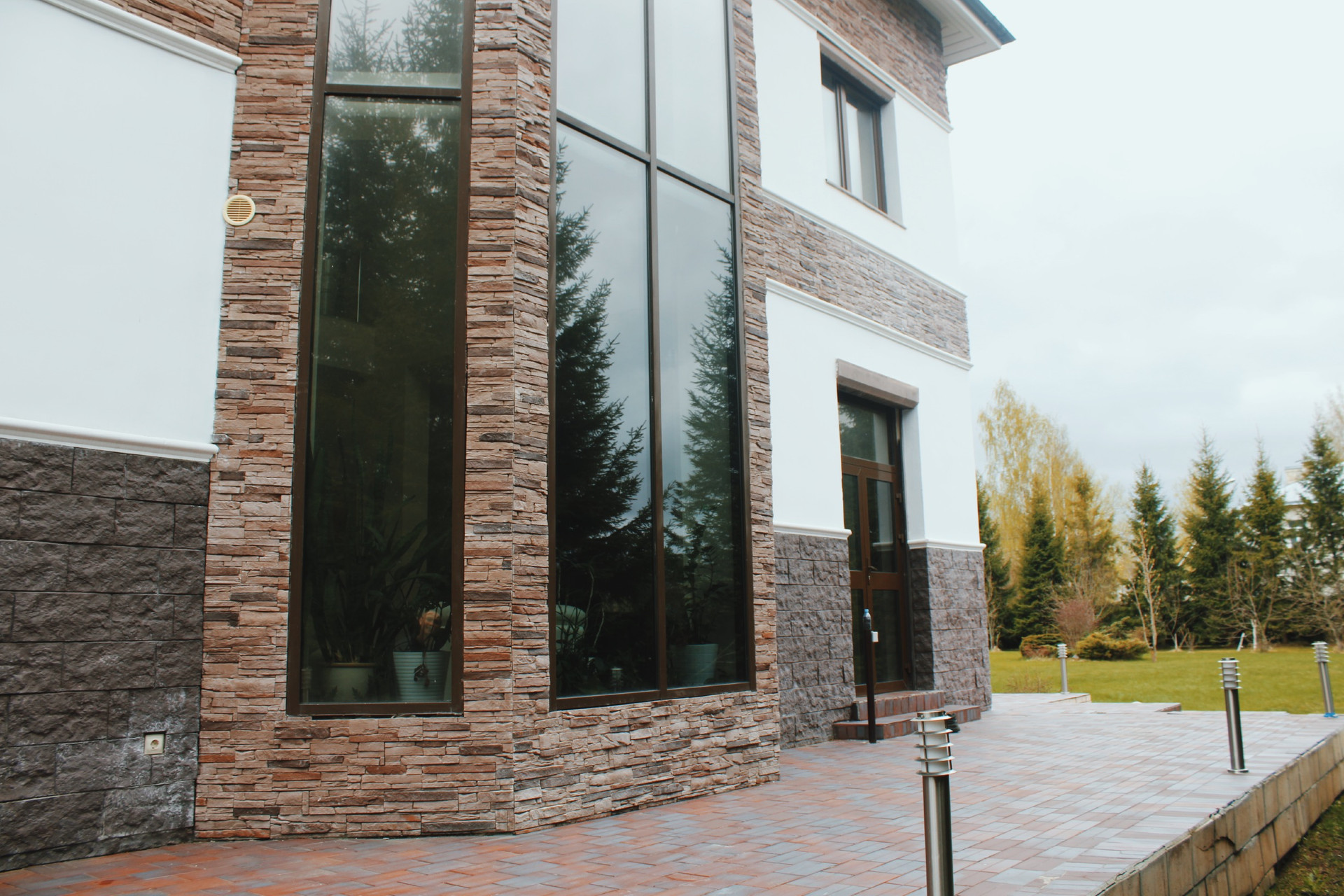 В доме первый этаж: гараж на 2 а/м с входом в дом. Кабинет, спальня, кухня-столовая, гостиная с камином, с/у.