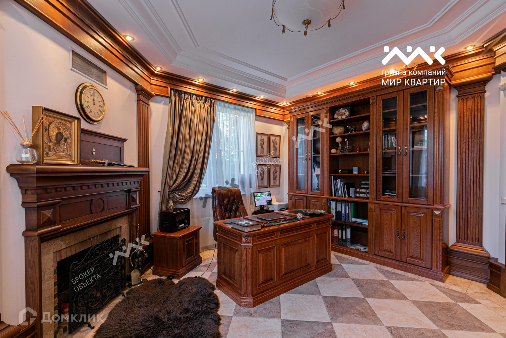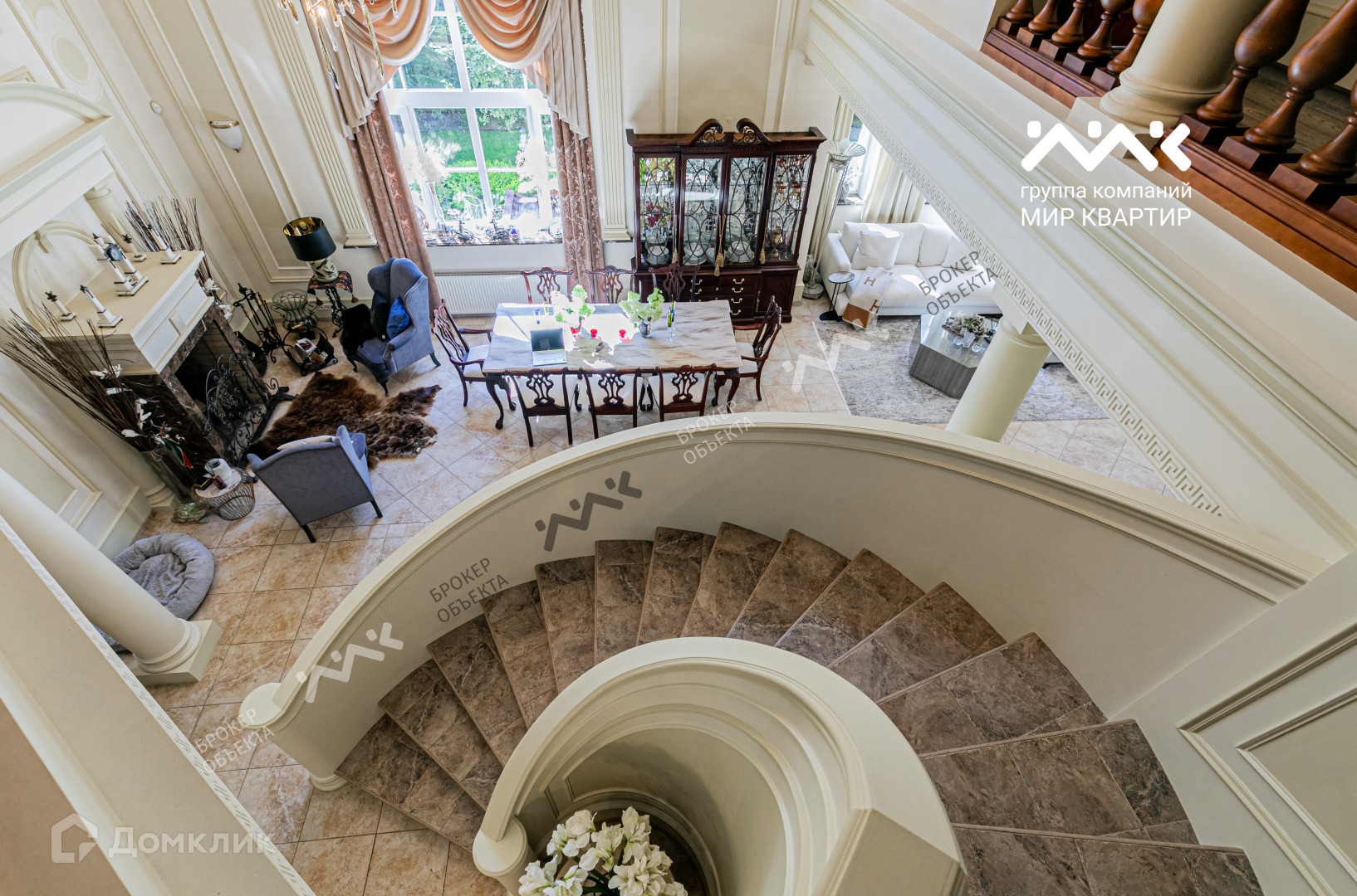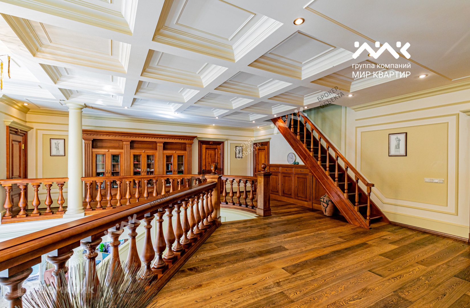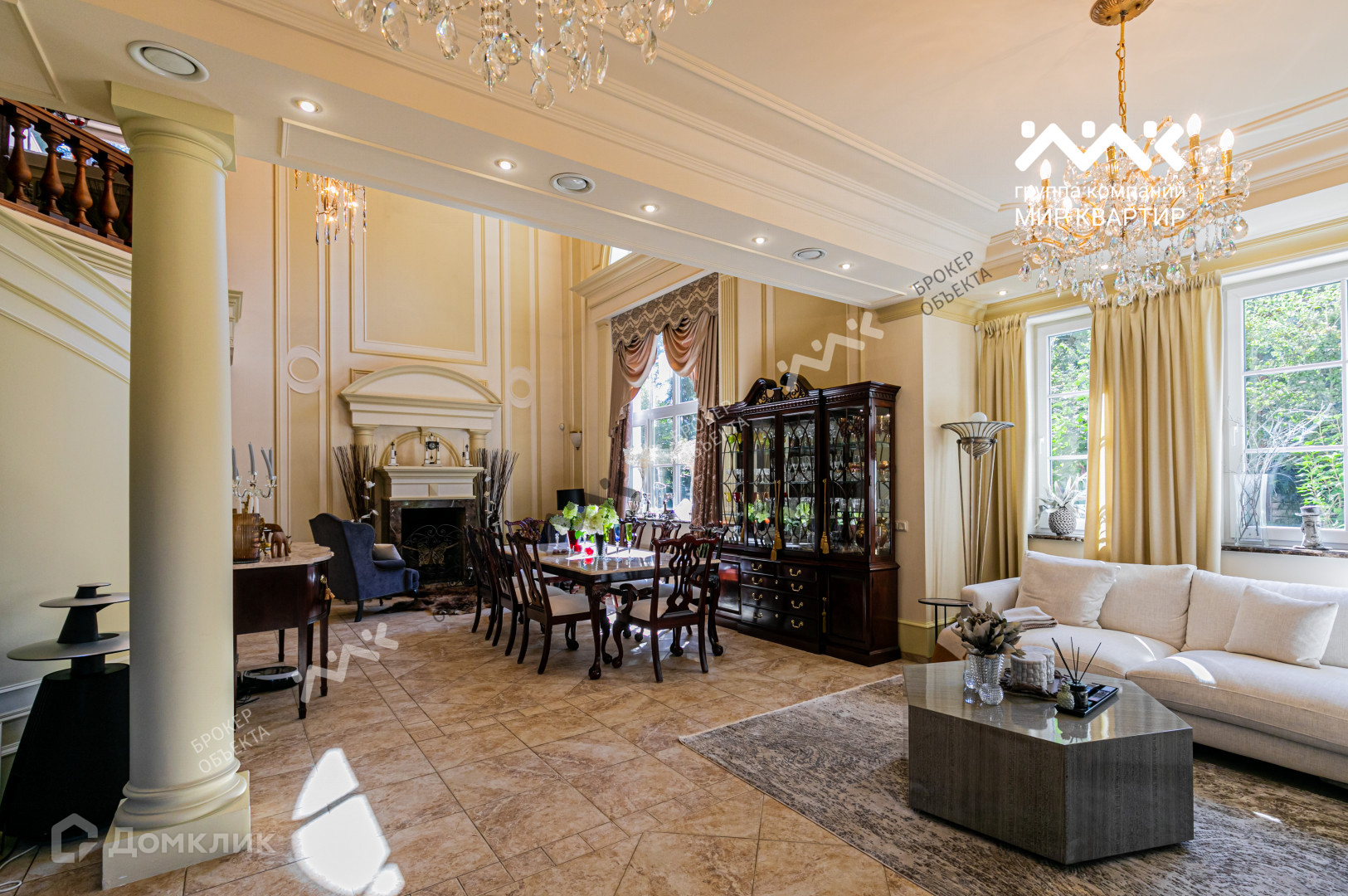 На первом этаже располагается: шикарная гостевая зона с парадной лестницей, дровяным камином и выходом на уютную террасу; зона кухни; кабинет с камином; гостевая комната, гостевой санузел с мини-сауной и хозяйственная комната.
