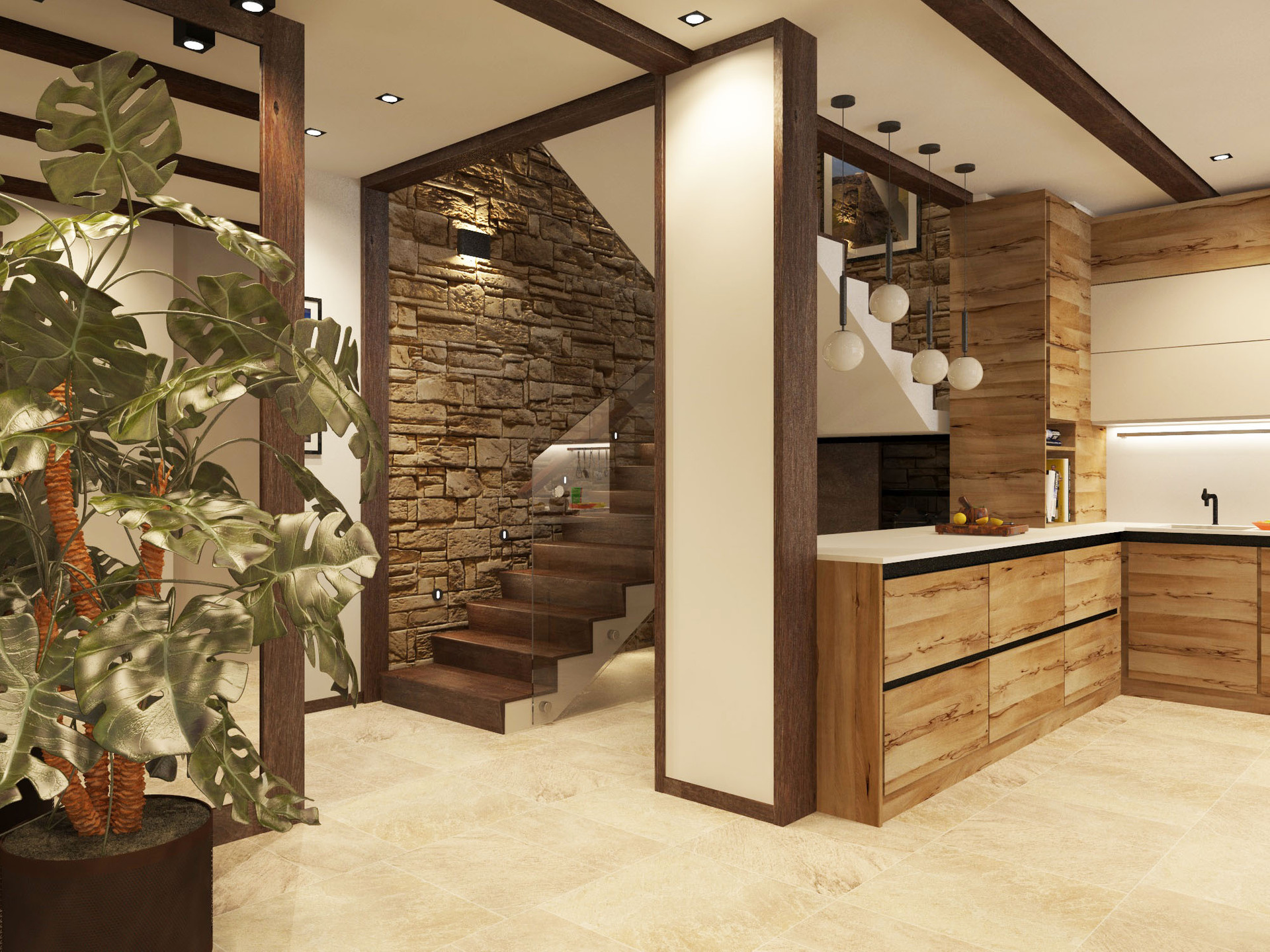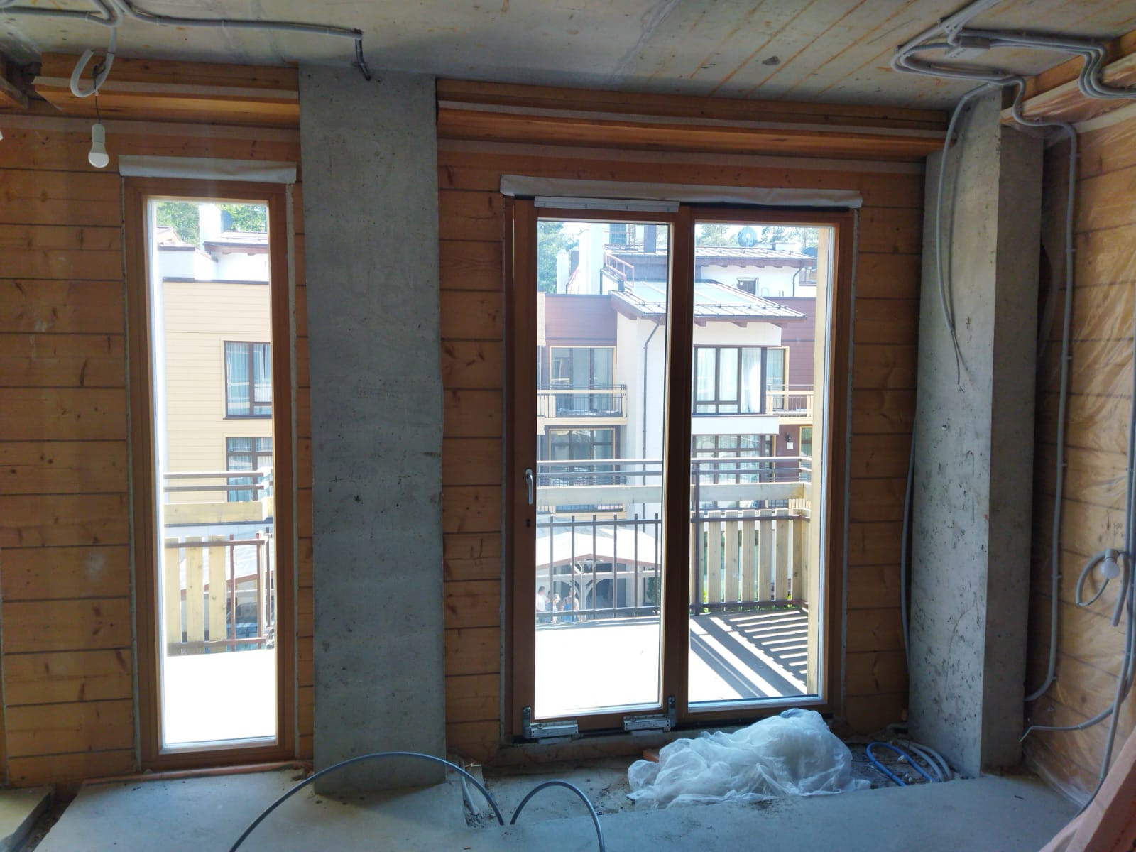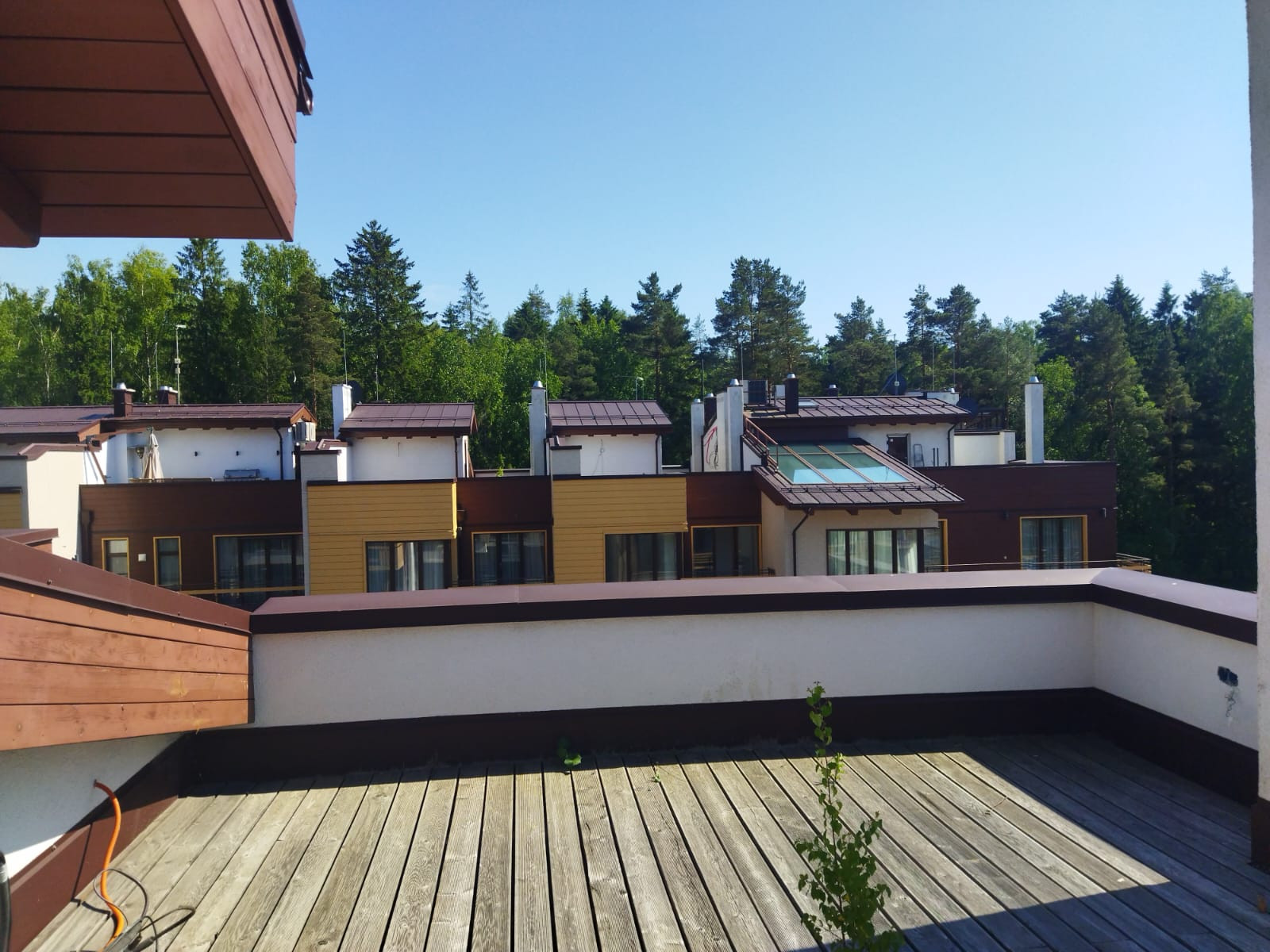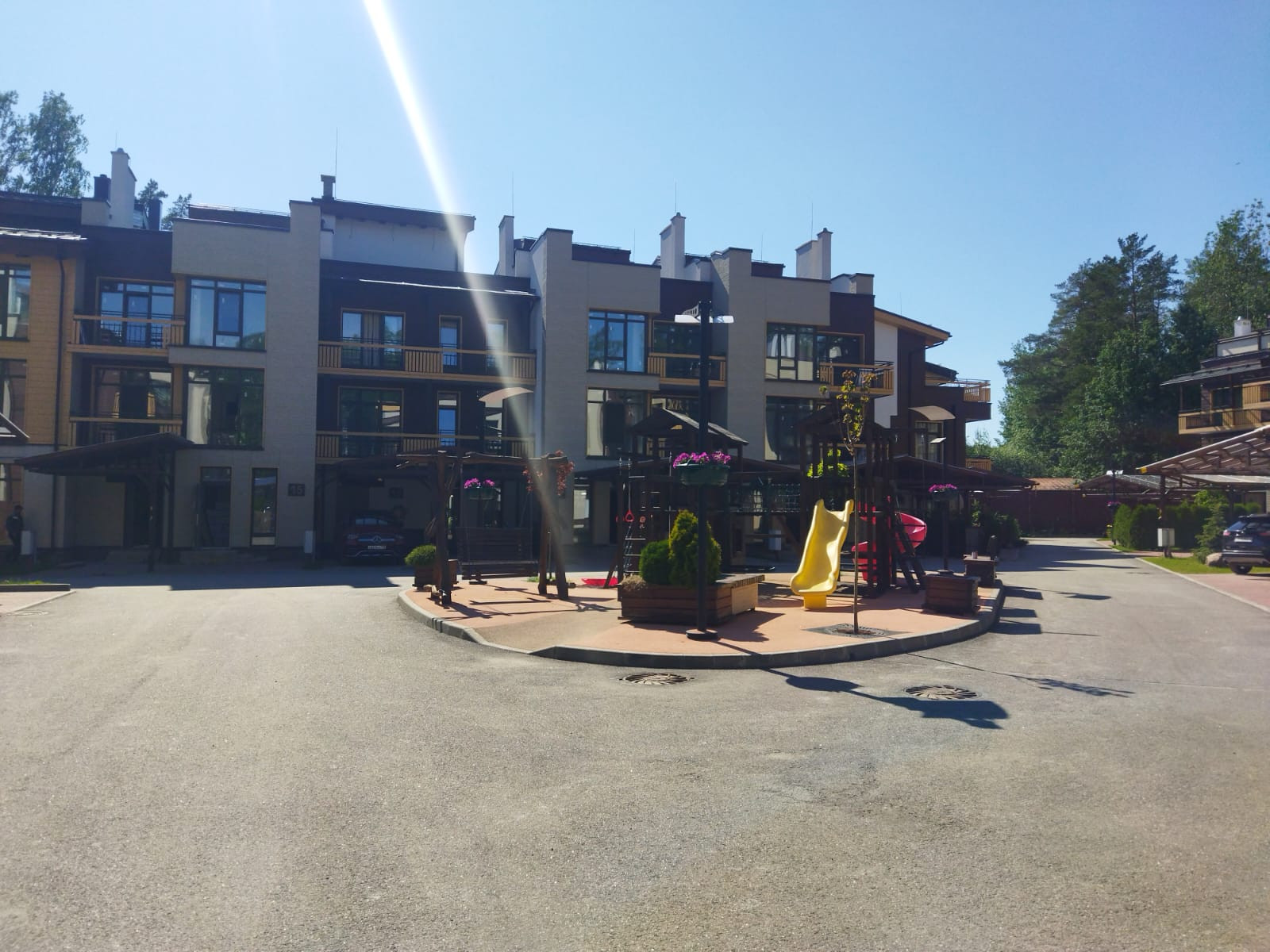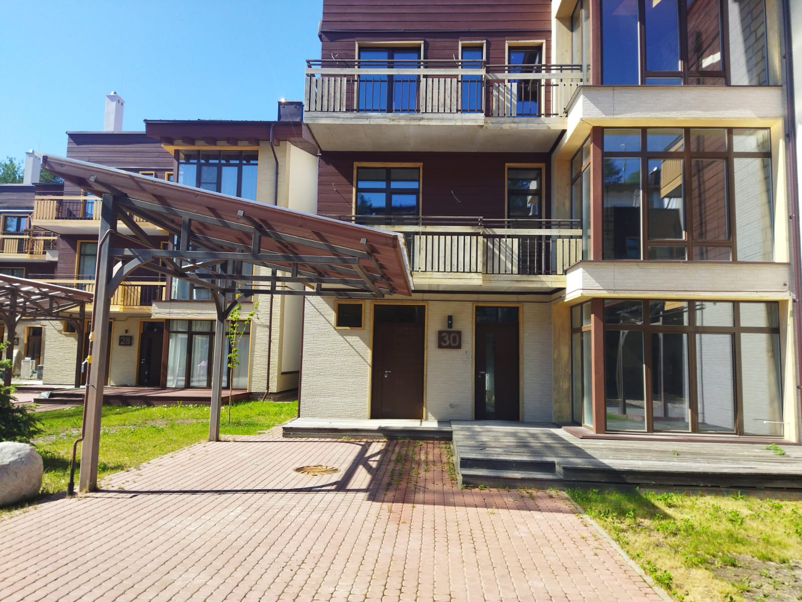 Комплекс включает в себя 33 индивидуальных сблокированных жилых дома. Трехэтажные таунхаусы из клееного бруса на железобетонном каркасе возведены по индивидуальному проекту с использованием материалов финской компании MamuttiHirsi. Кровля домов сделана эксплуатируемой: например, там можно организовать зону отдыха с сауной и джакузи. Каждая спальня имеет свой санузел и гардеробную. В жилых помещениях произведена чистовая отделка.