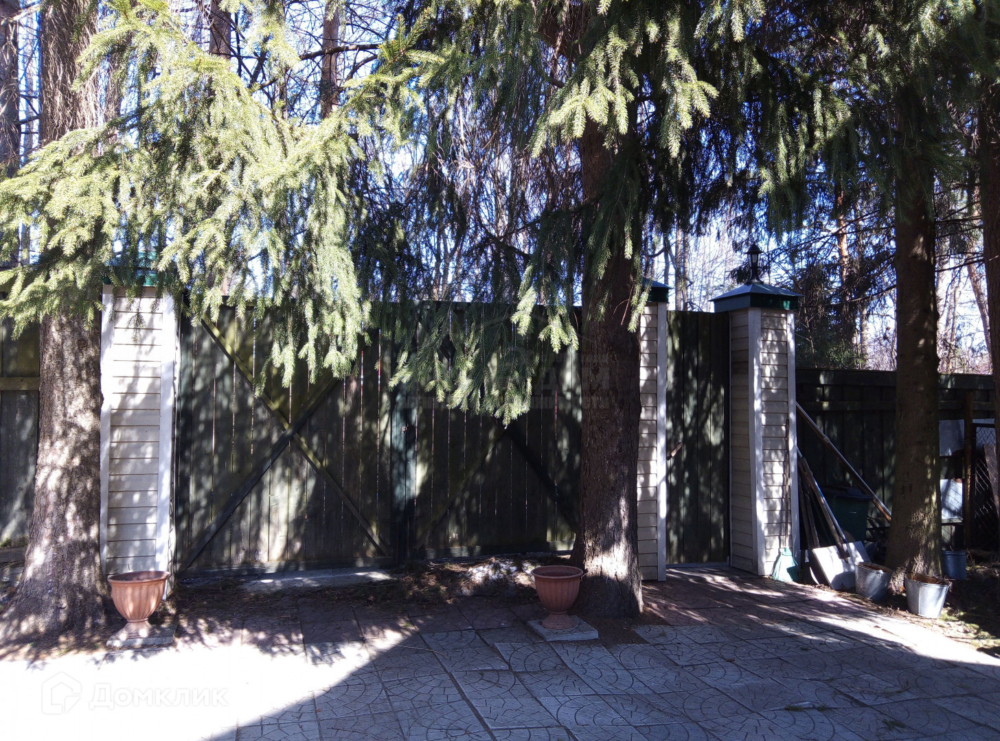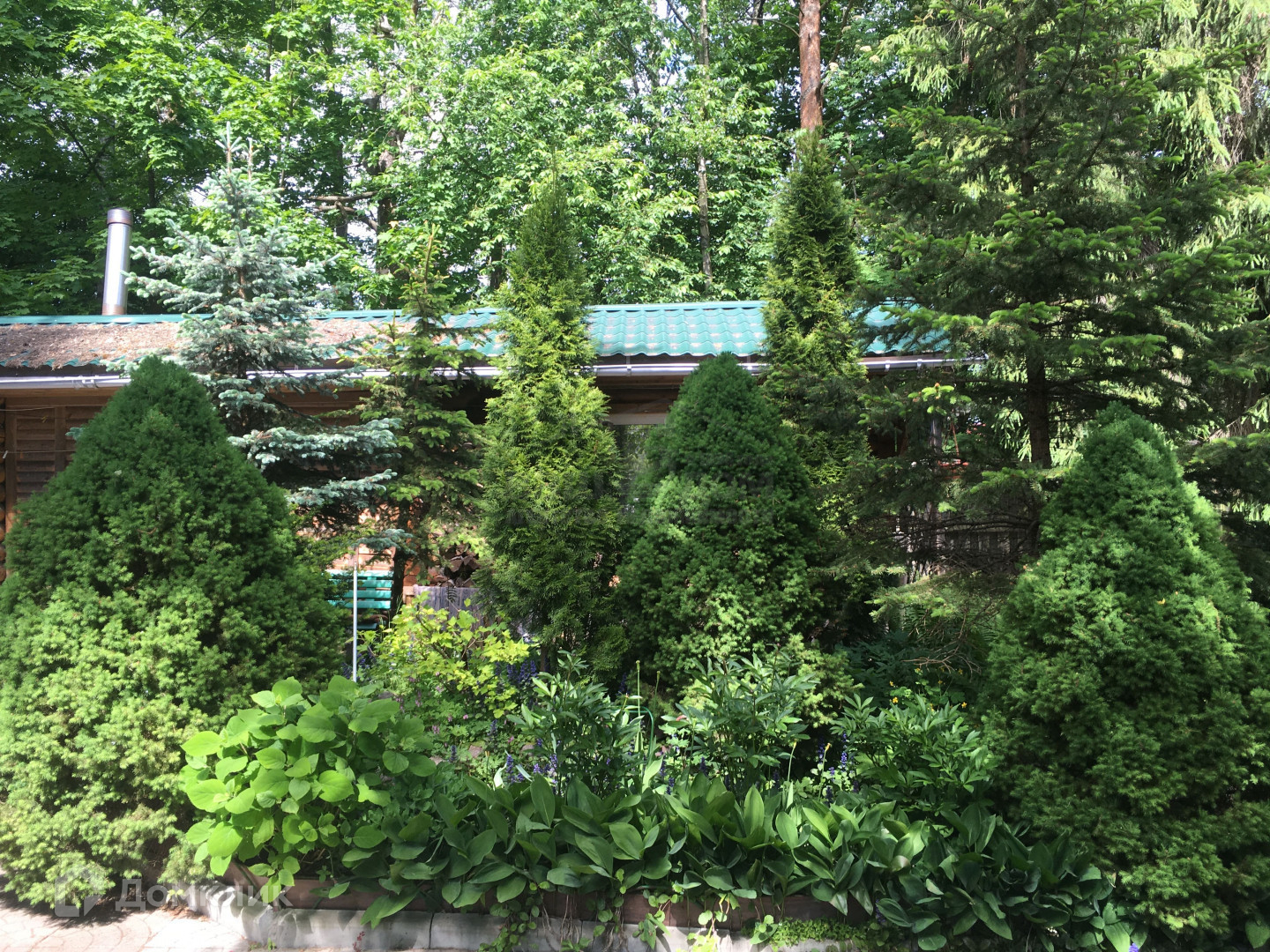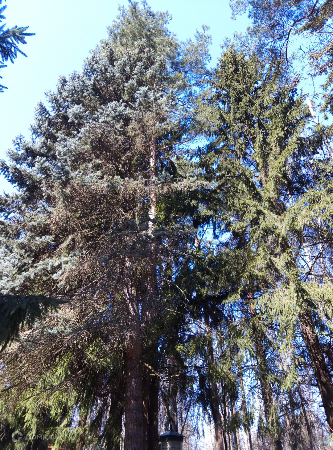 На участке растут высокие сосны, ели, туи.