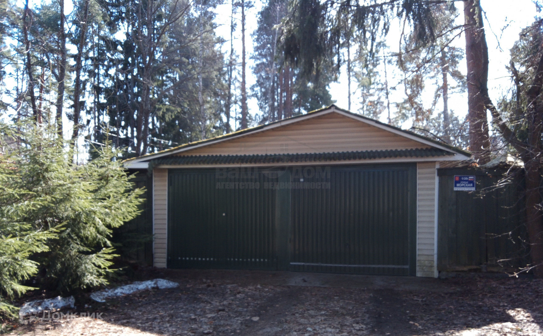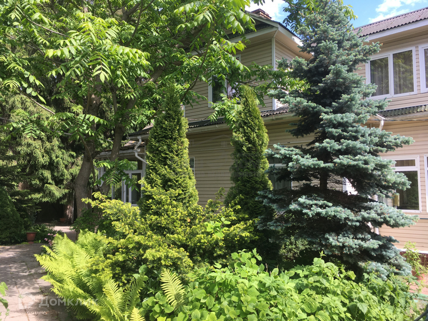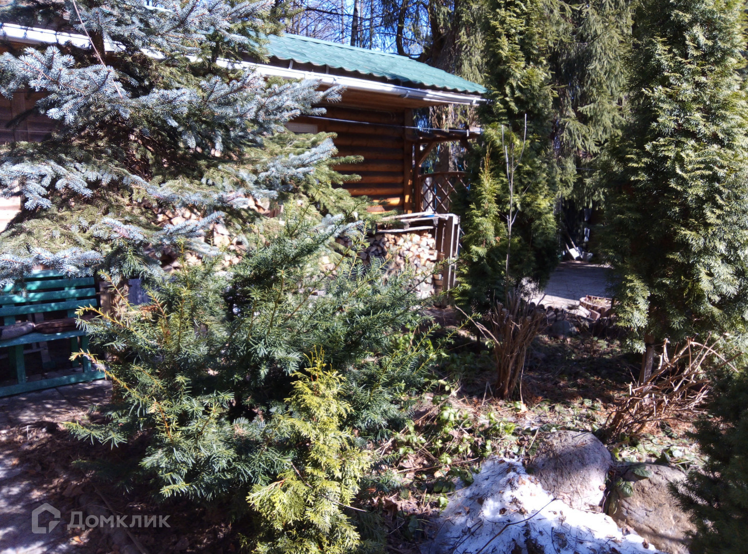 На участке растут высокие сосны, ели, туи.