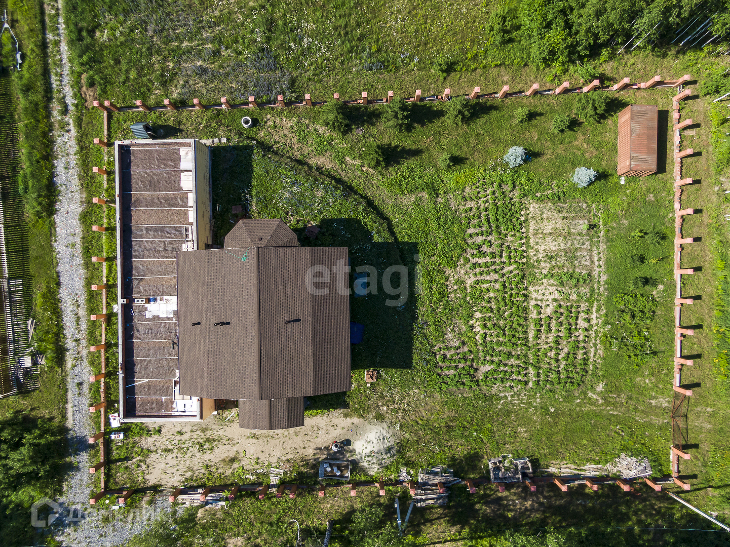 Кровля утеплена, а также выполнено на 100% утепление внешнего контура. Установлен металлический лестничный марш. Въезд в гараж оборудован воротами с автоматическим подъемным механизмом. По всему периметру участка установлены кирпичные столбы для забора, тип секций вы сможете выбрать на свой вкус.