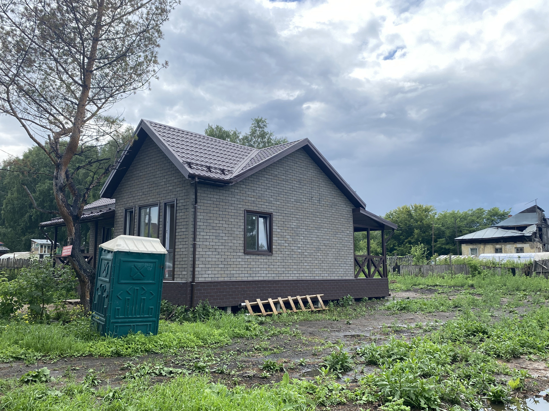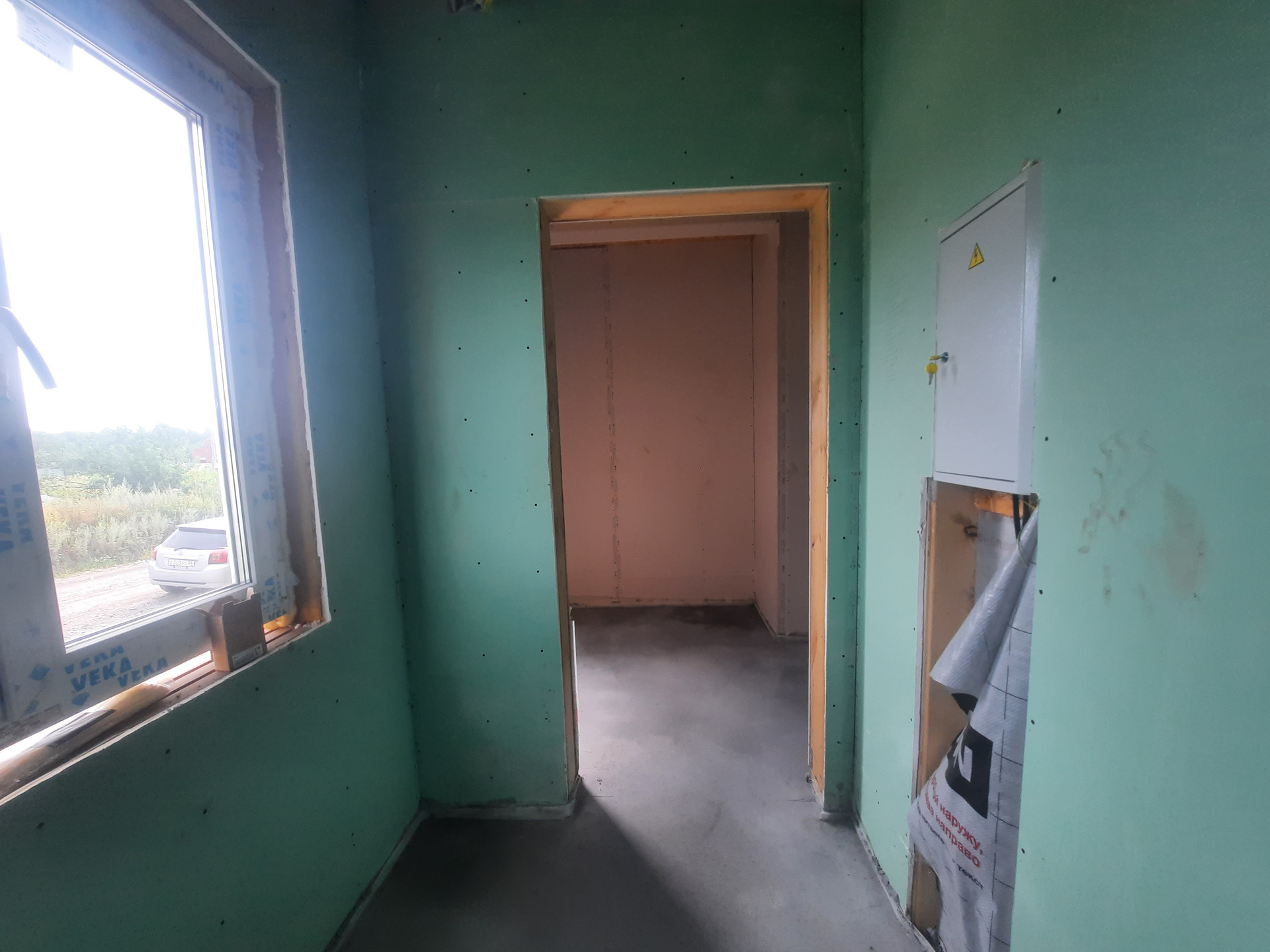 Дом в предчистовой отделке: разведены все коммуникации (отопление: радиаторы, электричество, вода). Стены обшиты гипсокартоном. Установлены: септик, дверь с терморазрывом, кашированные окна, кровля, фасад.