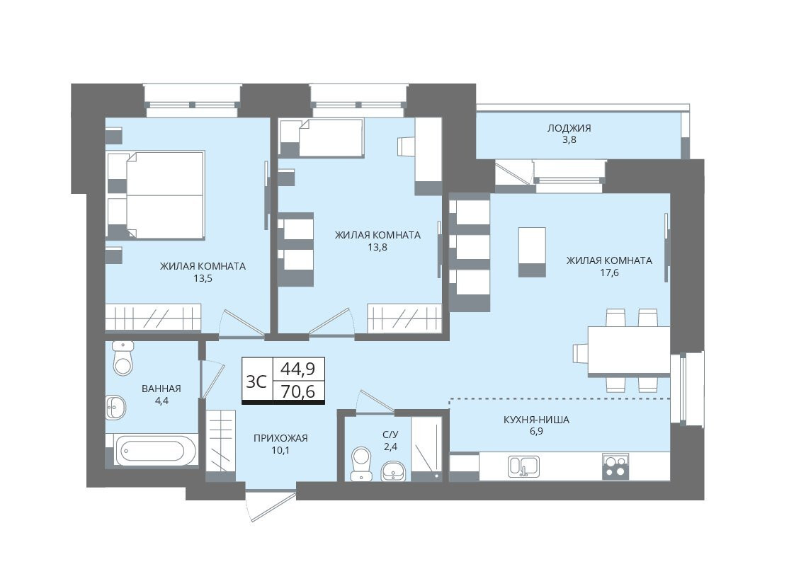 Общая площадь 70.6 м2