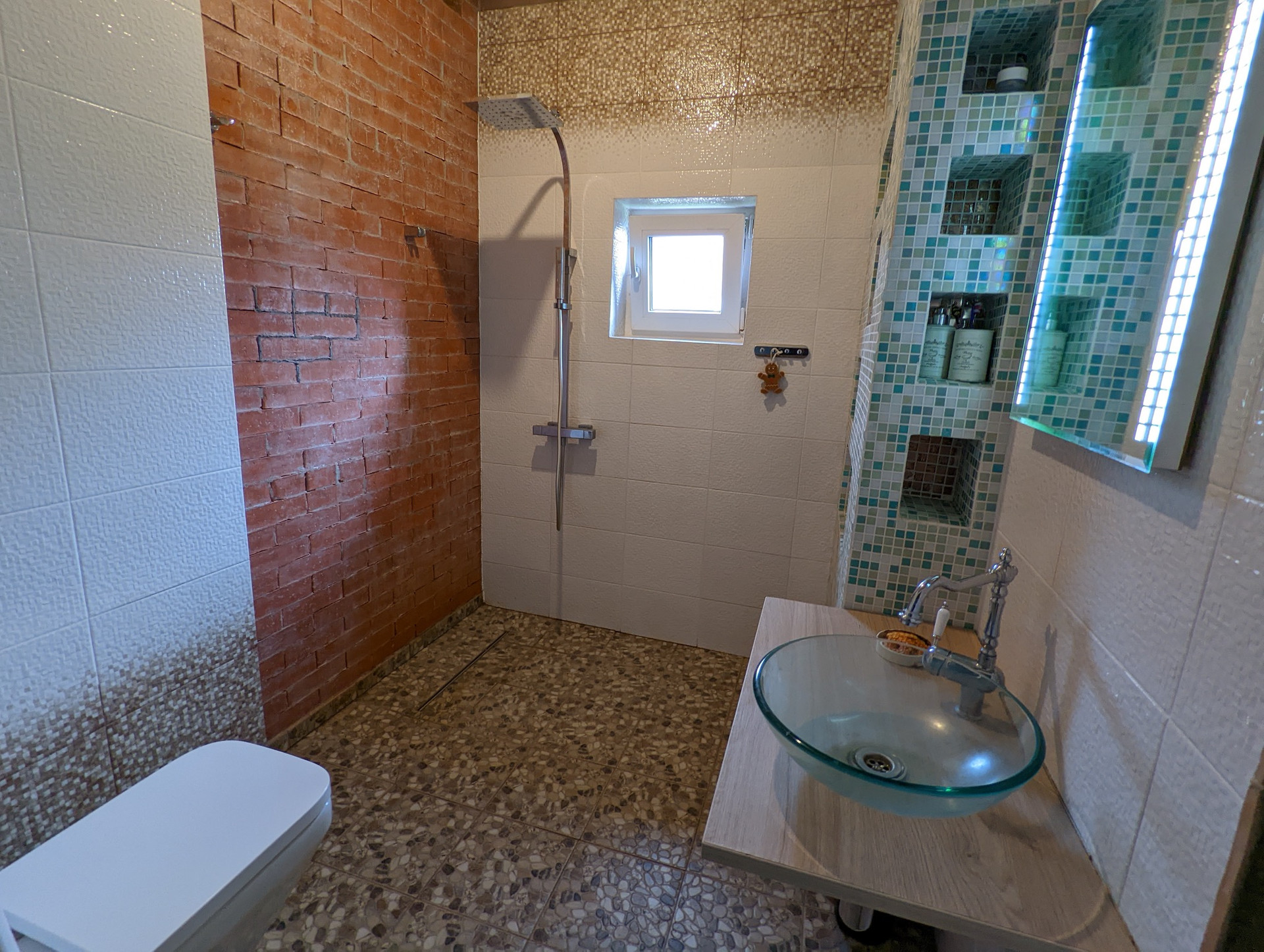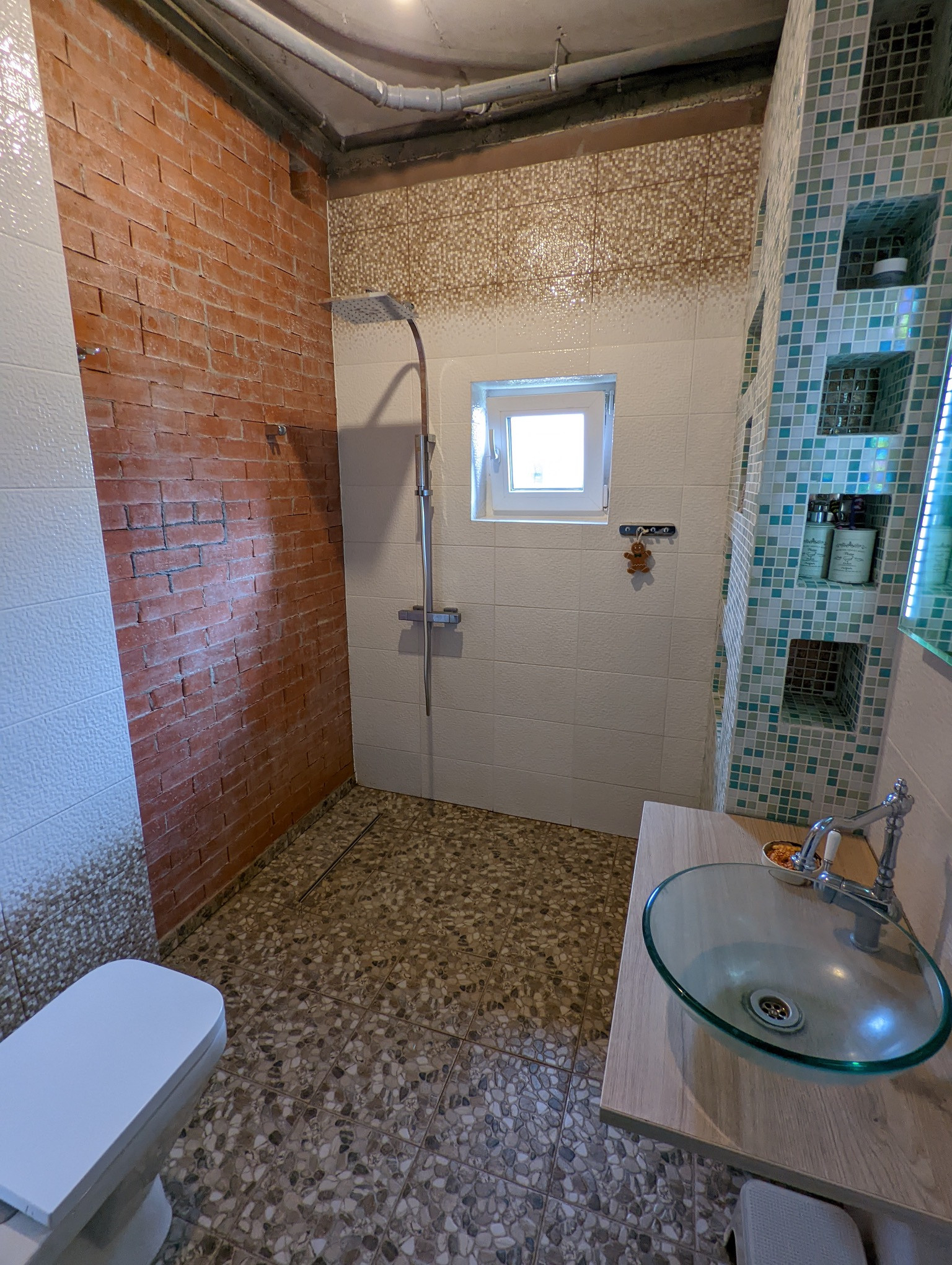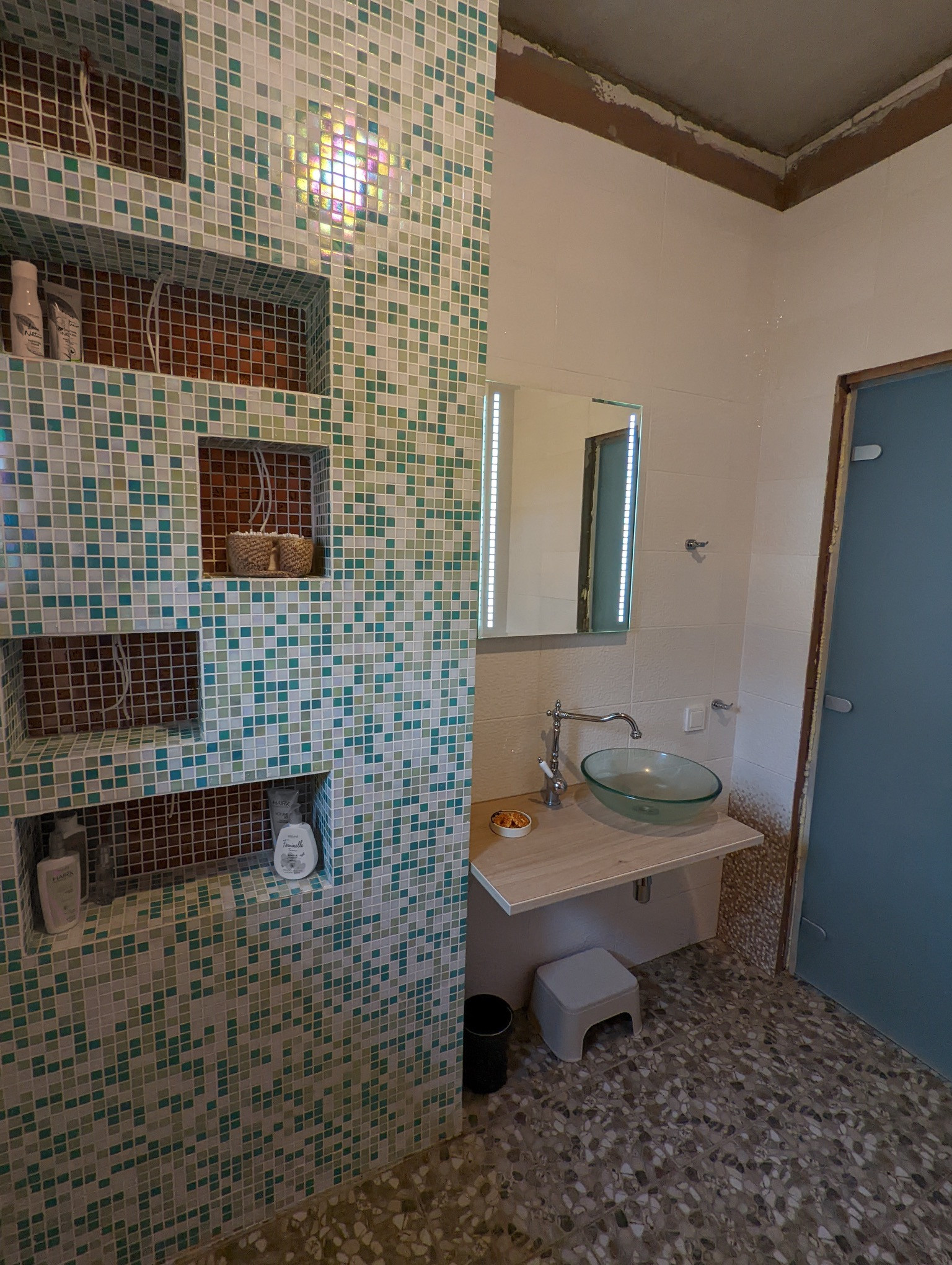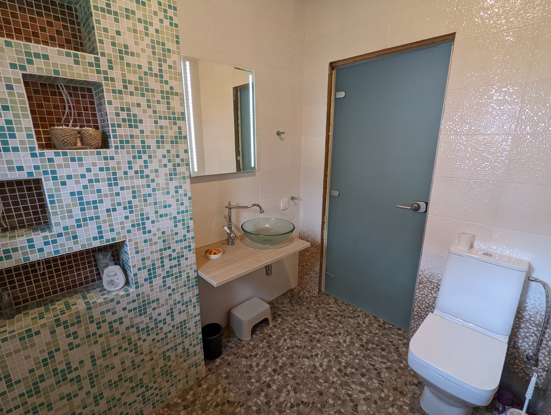 С/У керамическая плитка, мозаика, комплект санфаянса, дверь стеклянная