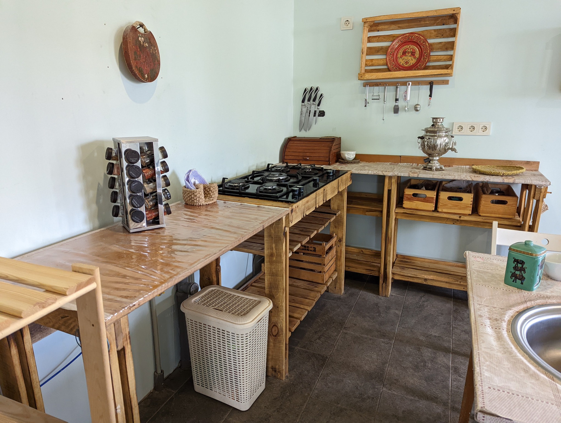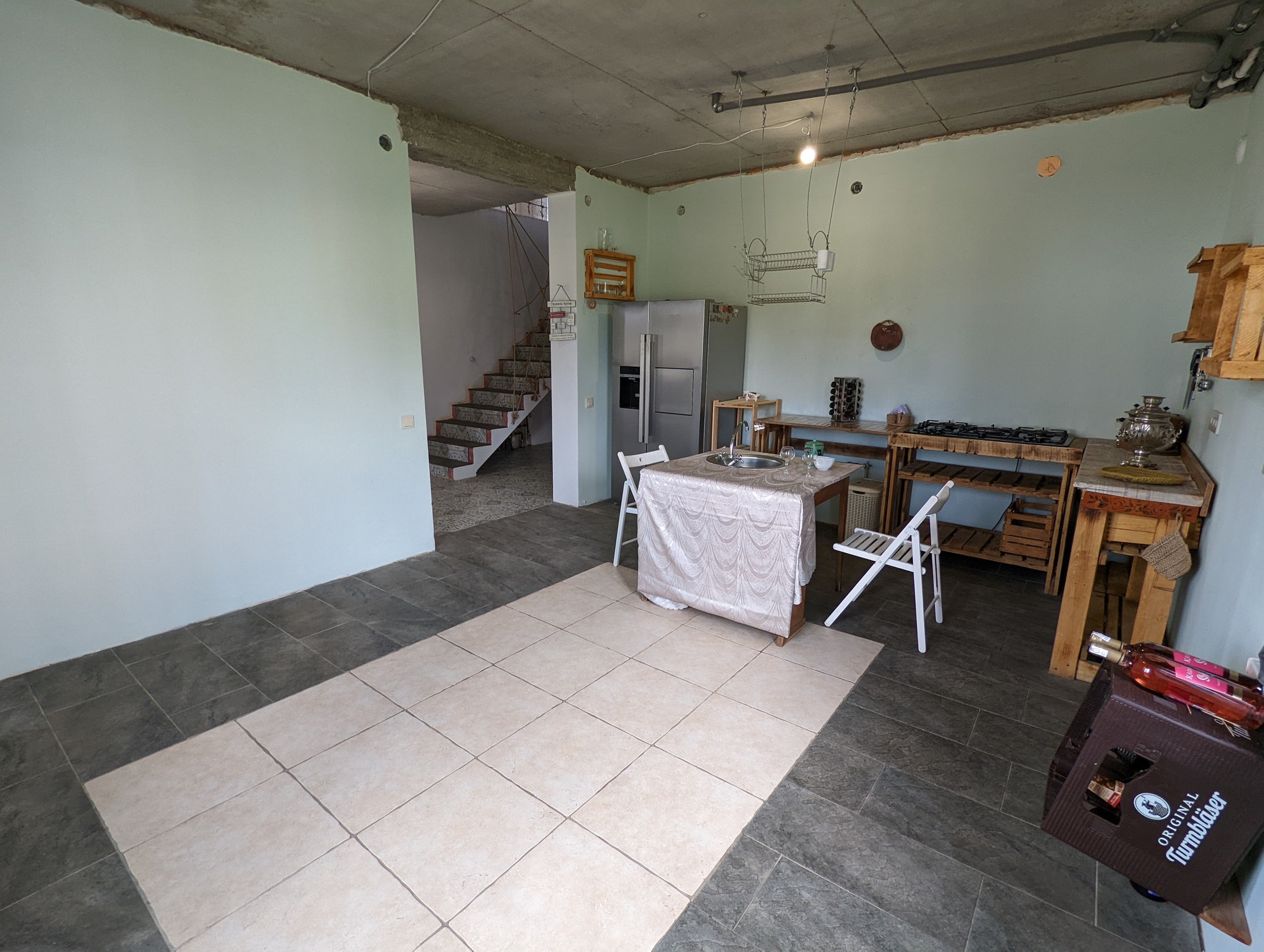 1 этаж : кухня, гостиная, прихожая, холл, с/у, гараж, кладовая, бойлерная