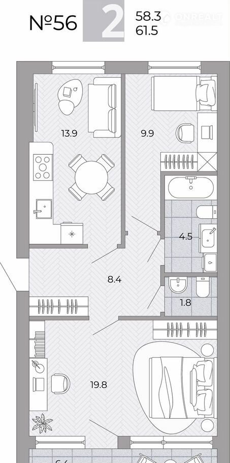 Общая площадь 61.5 м2