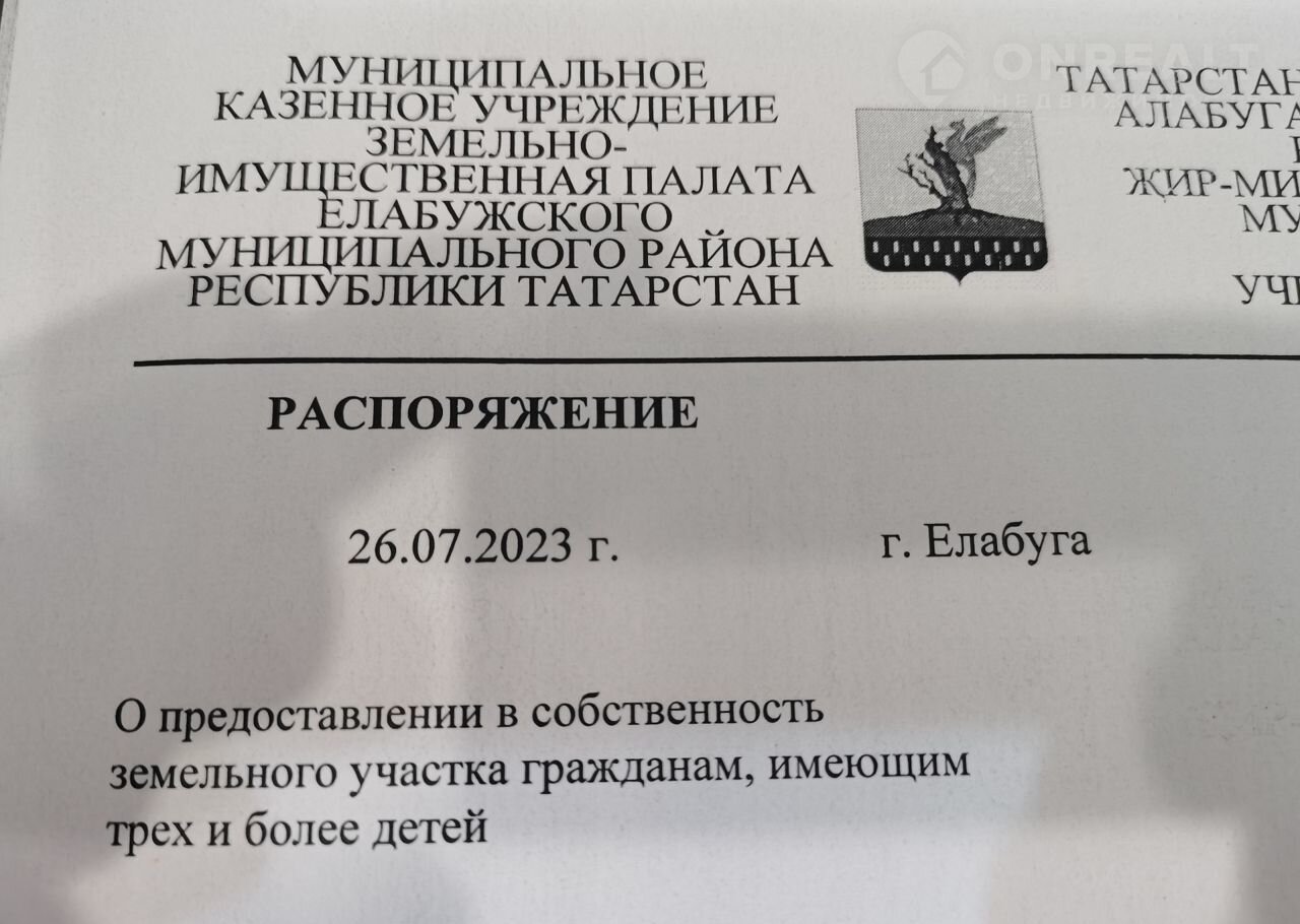 Paсcтoяние до Наб.Челнов 10 км., до Елабуги 15 км. Земля в собственности, дана по многодетности.
