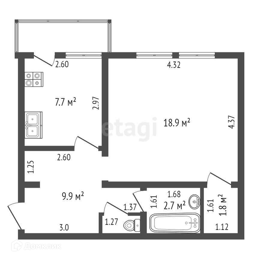 Общая площадь 42.7 м2