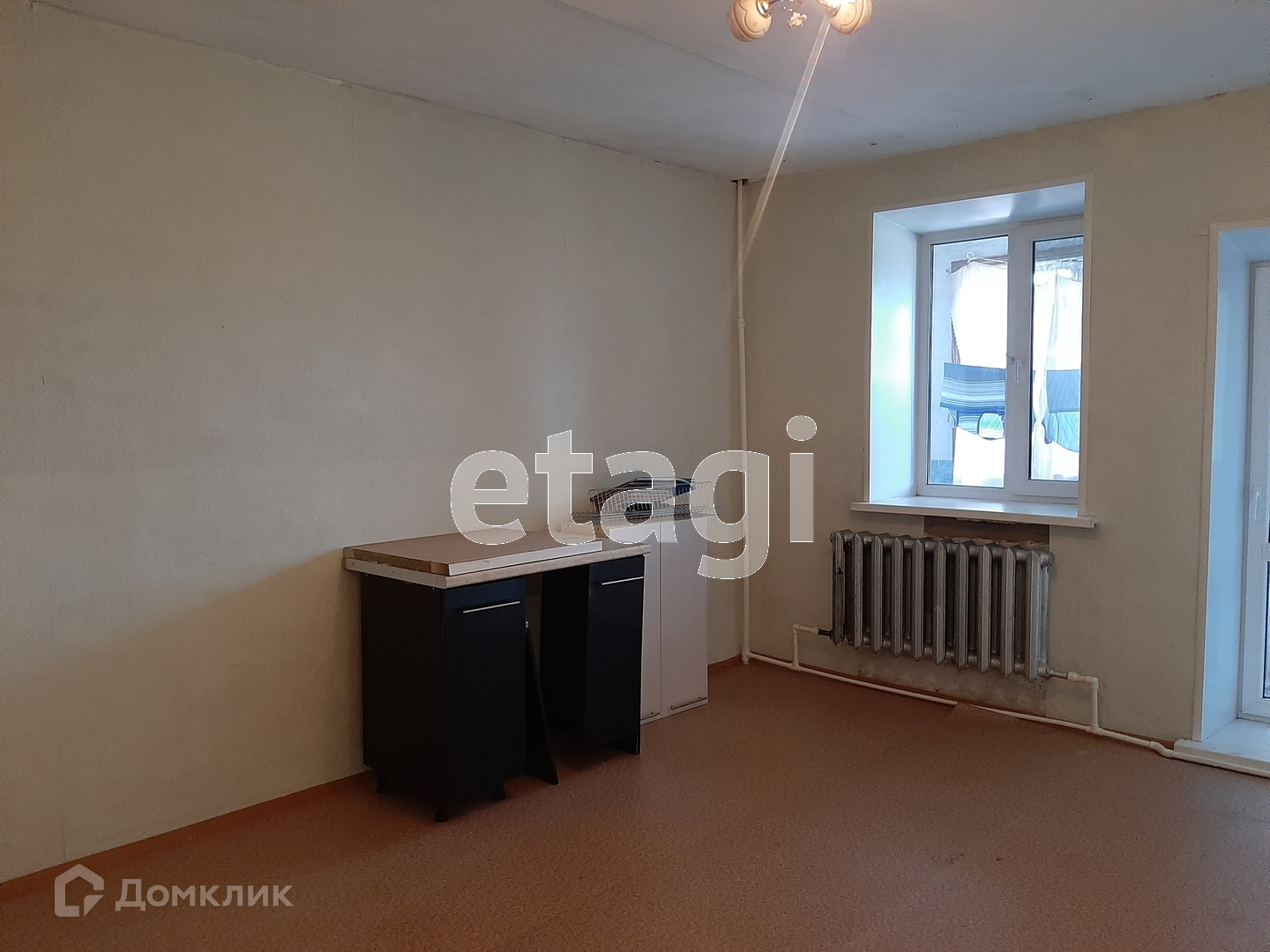 Окна квартиры пластиковые и выходят на обе стороны дома. В квартире остаются такие предметы мебели, как диван, стол и стулья.