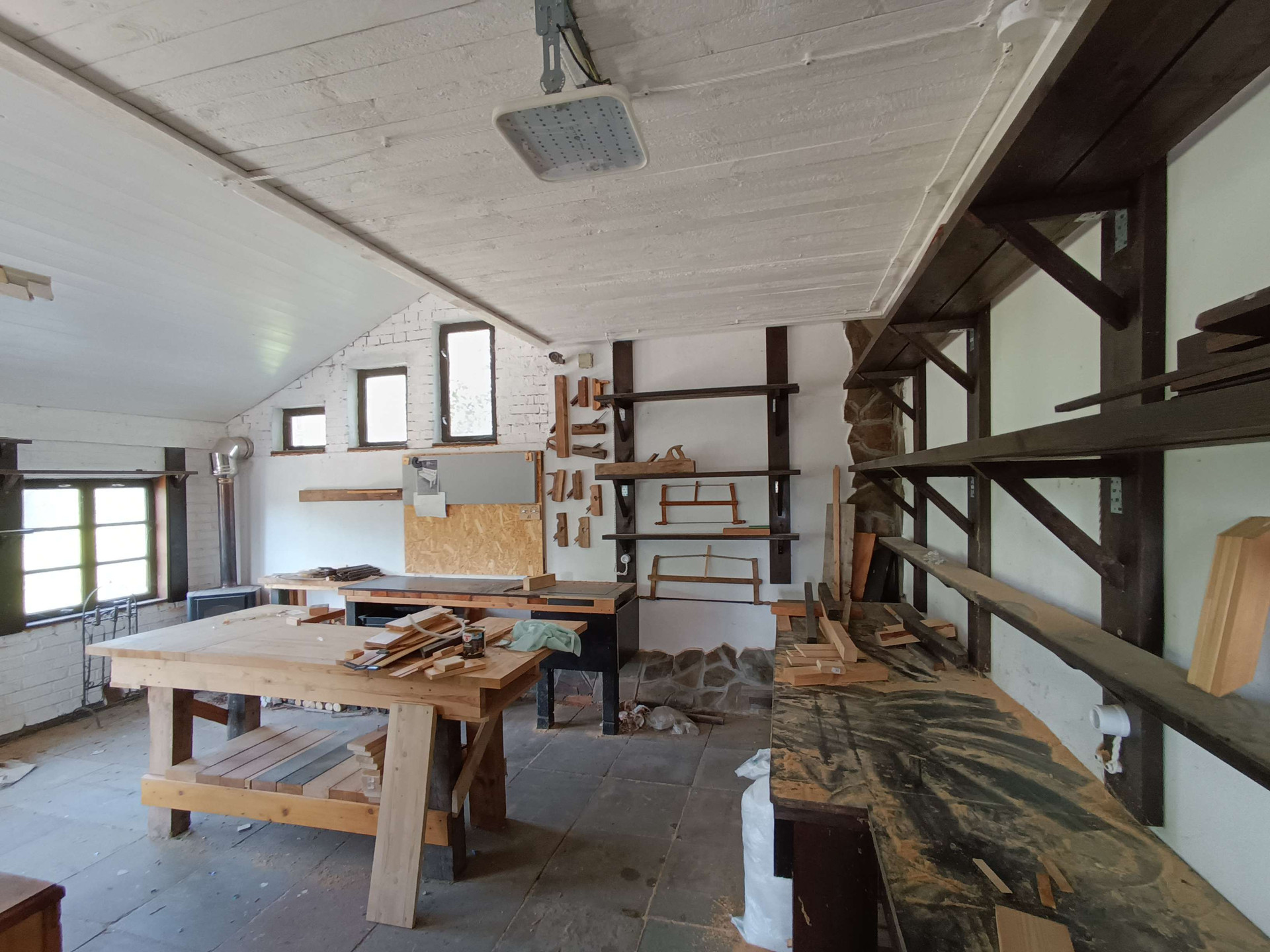 - на первом этаже расположены: кухня- гостиная, гараж, санузел, мастерская.