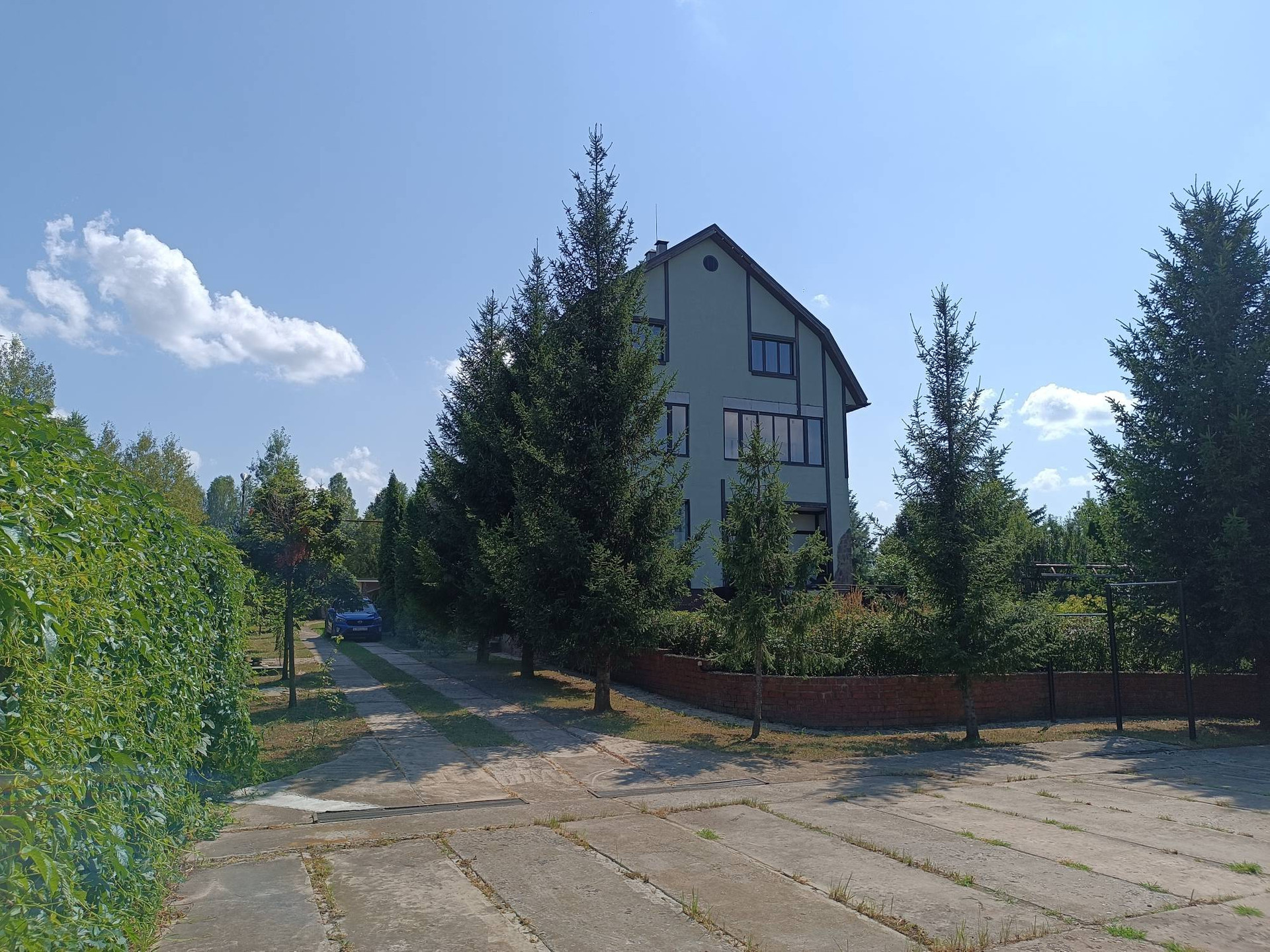 - на первом уровне расположены: основной дом, зона барбекю, малый дом, парковка для автомобилей. На территории выполнен ландшафтный дизайн, произрастают множество деревьев, кустарников и цветов. Разведена автоматическая система полива,установлена система видеонаблюдения.