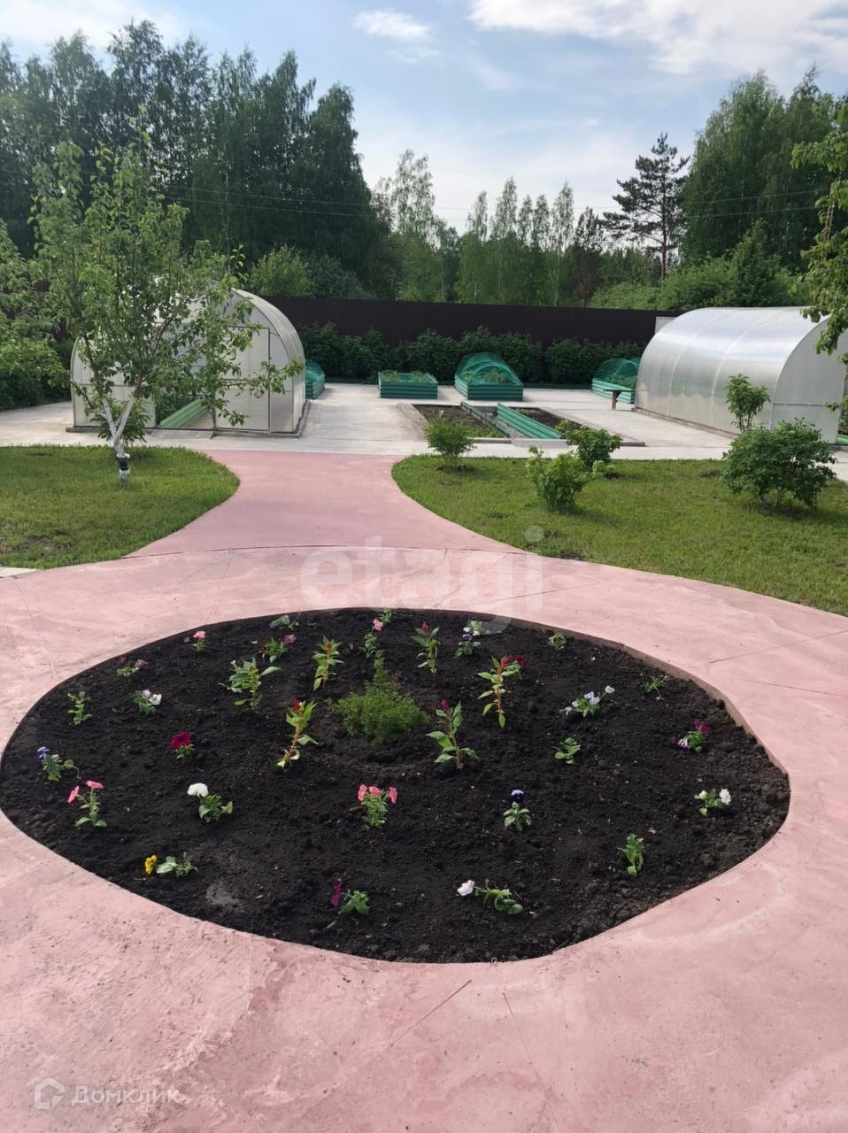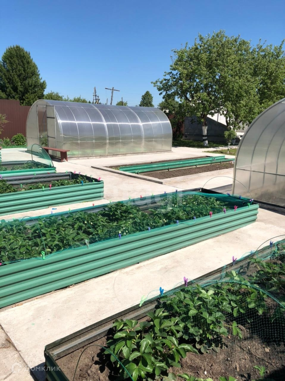 Имеются две теплицы,грядки с посаженными ягодами и овощами.Плодовые деревья.