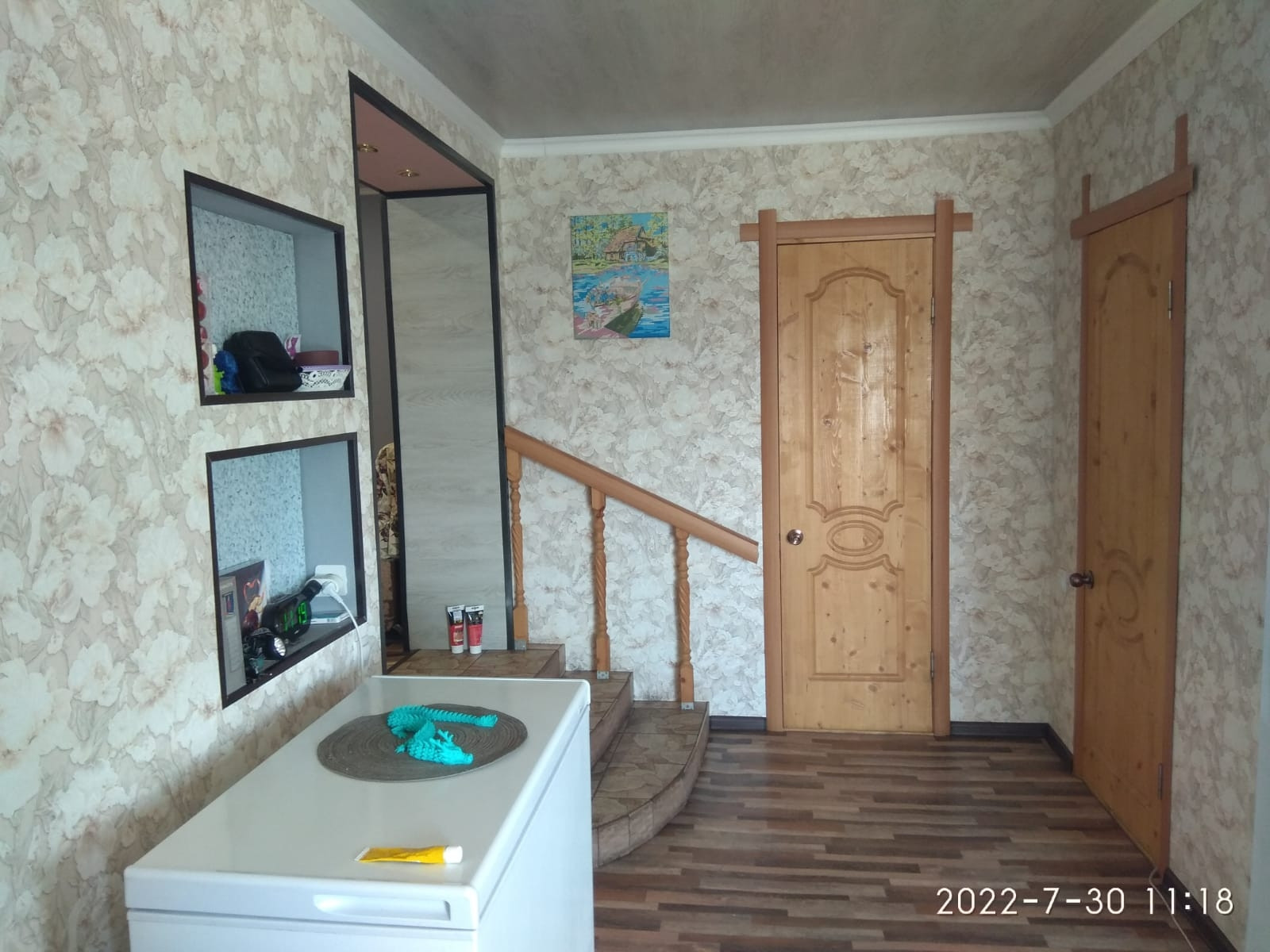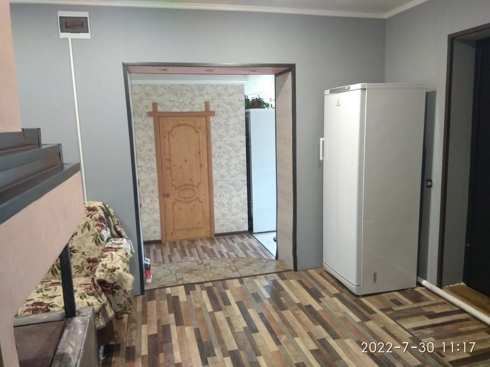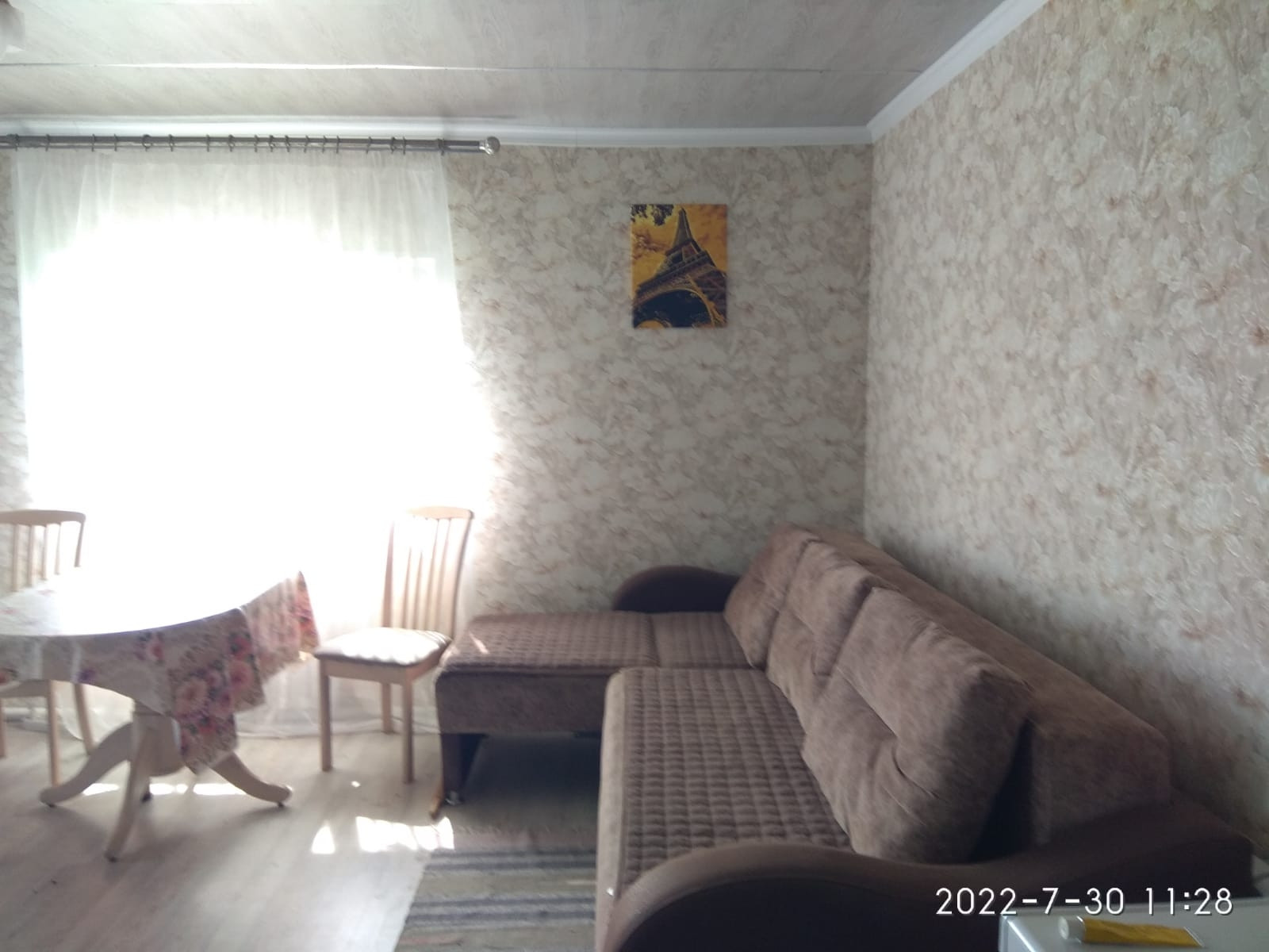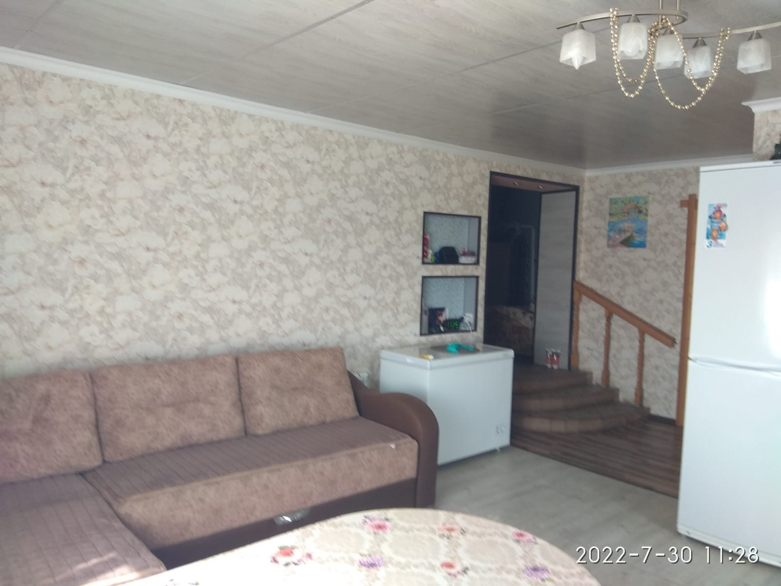 В доме два дивана, один большой, новый холодильник, кухонный гарнитур, стол.