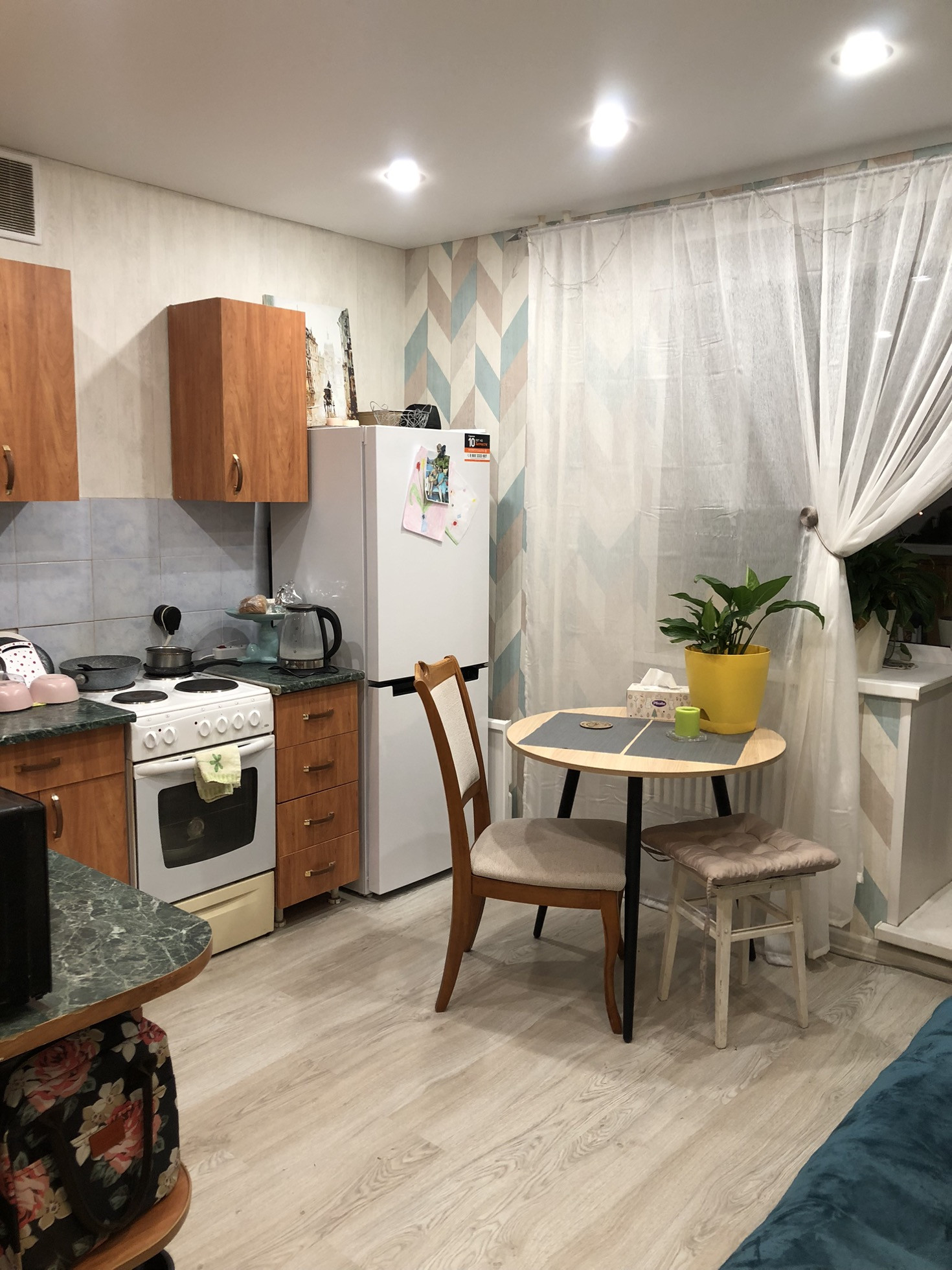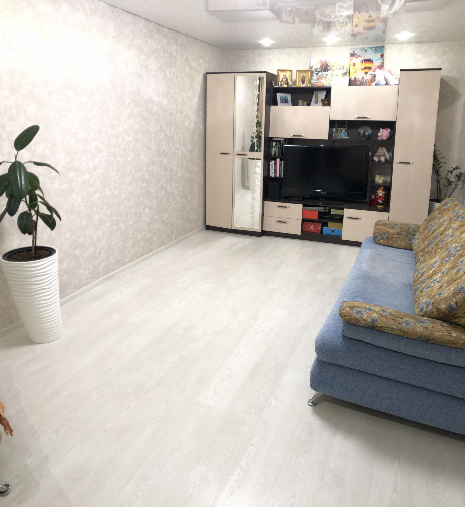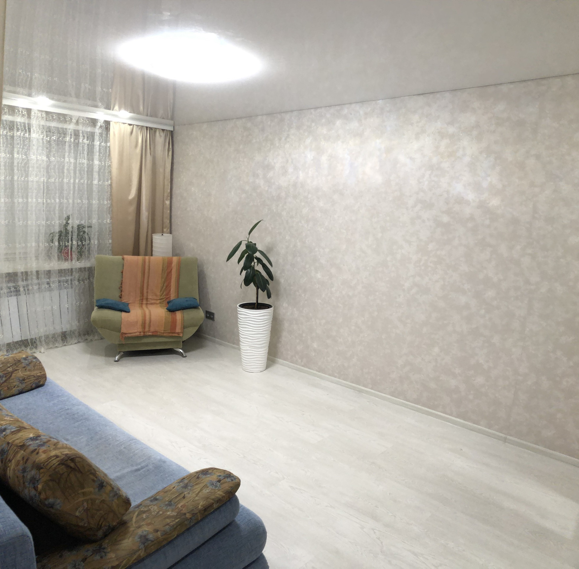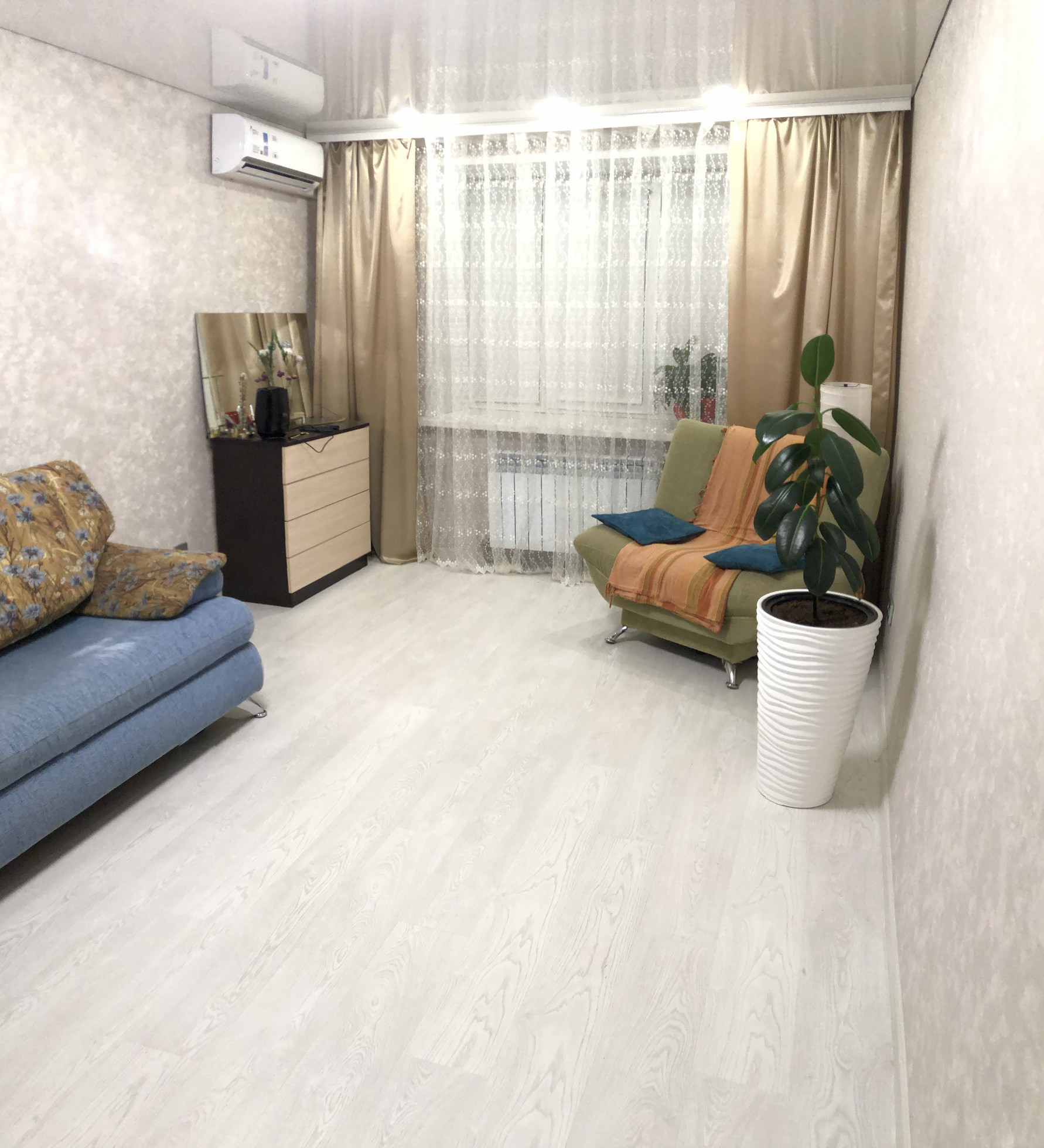 Новый косметический ремонт, все новое, ламинат, обои, сантехника. Огромная 12м. кухня. Натяжные потолки. Огромный балкон с встроенными полками. Метровые стены из кирпича. Гардеробная в коридоре встроенная. Мебель по договоренности. Кондиционер. Во дворе закрытая от машин детская площадка. Сады, школы, магазины все в шаговой доступности, остановка, не более 7 минут неспешно. Квартира очень теплая, балкон открыт зимой постоянно.