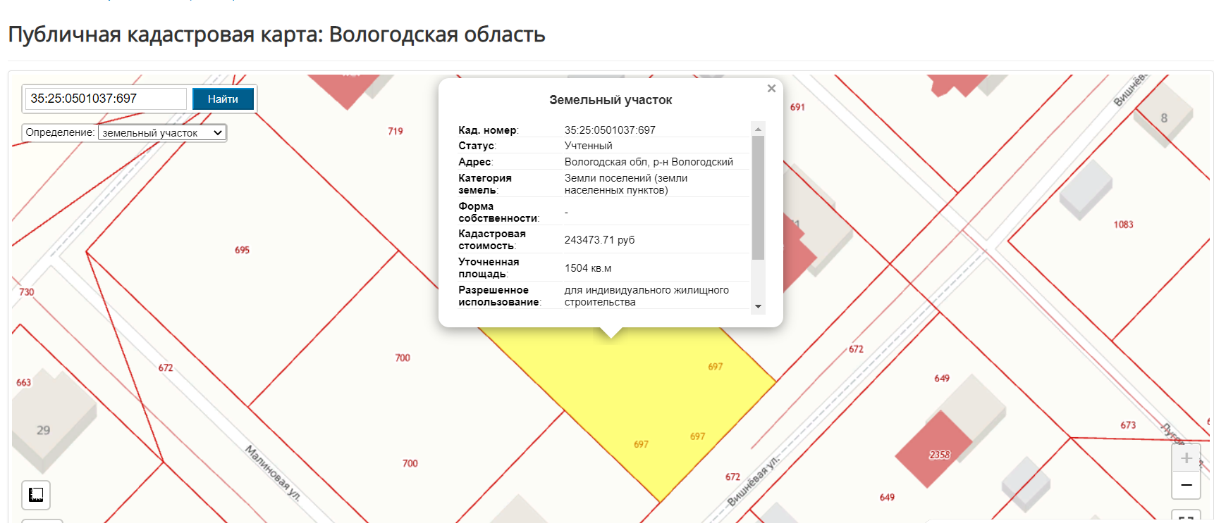 Кадастровый номер участка: 35:25:0501037:697.